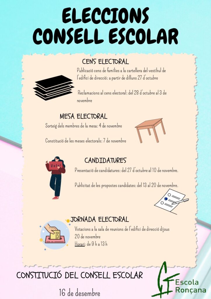 S’han convocat eleccions al Consell Escolar, tal com marca la resolució EDU/3043/2021 del 6 d’octubre, per la qual s’estableix el calendari i el règim del procés electoral per renovar els membres dels consells escolars dels centres públics i privats sostinguts amb fons públic. Us recordem que el Consell Escolar és el màxim òrgan de participació