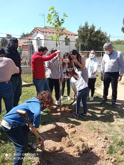 La convivència, tot i estar en pandèmia i seguir fil per randa les instruccions del Departament de Sanitat, ha estat molt bona i tant el professorat de l’IES com els seus alumnes se senten molt còmodes amb nosaltres. És per això, que amb motiu de la celebració de la Setmana Cultural, van decidir fer-nos un regal el dia de Sant Jordi. Van pensar en regalar-nos quelcom que perdurés en el temps i que deixés empremta i, a més, que el seu valor no fos només econòmic. I que millor que… dos arbres per al nostres patis! Efectivament, ens van regalar un roure americà i una morera. El roure s’ha plantat al darrere de les grades de la pista nova i la morera al costat de l’hort. La plantada es va fer el dia de Sant Jordi al matí amb els mestres i els alumnes de l’institut i una representació de nens i nenes de la nostra escola, concretament de 2n de Primària. Va ser un acte molt emotiu i ple de germanor entre grans i petits. De ben segur que els nostres infants i els arbres creixeran molt i quan els nens i nenes arribin a l’institut, la morera i el roure continuaran arrelats a la nostra escola i hauran crescut tant com ells!