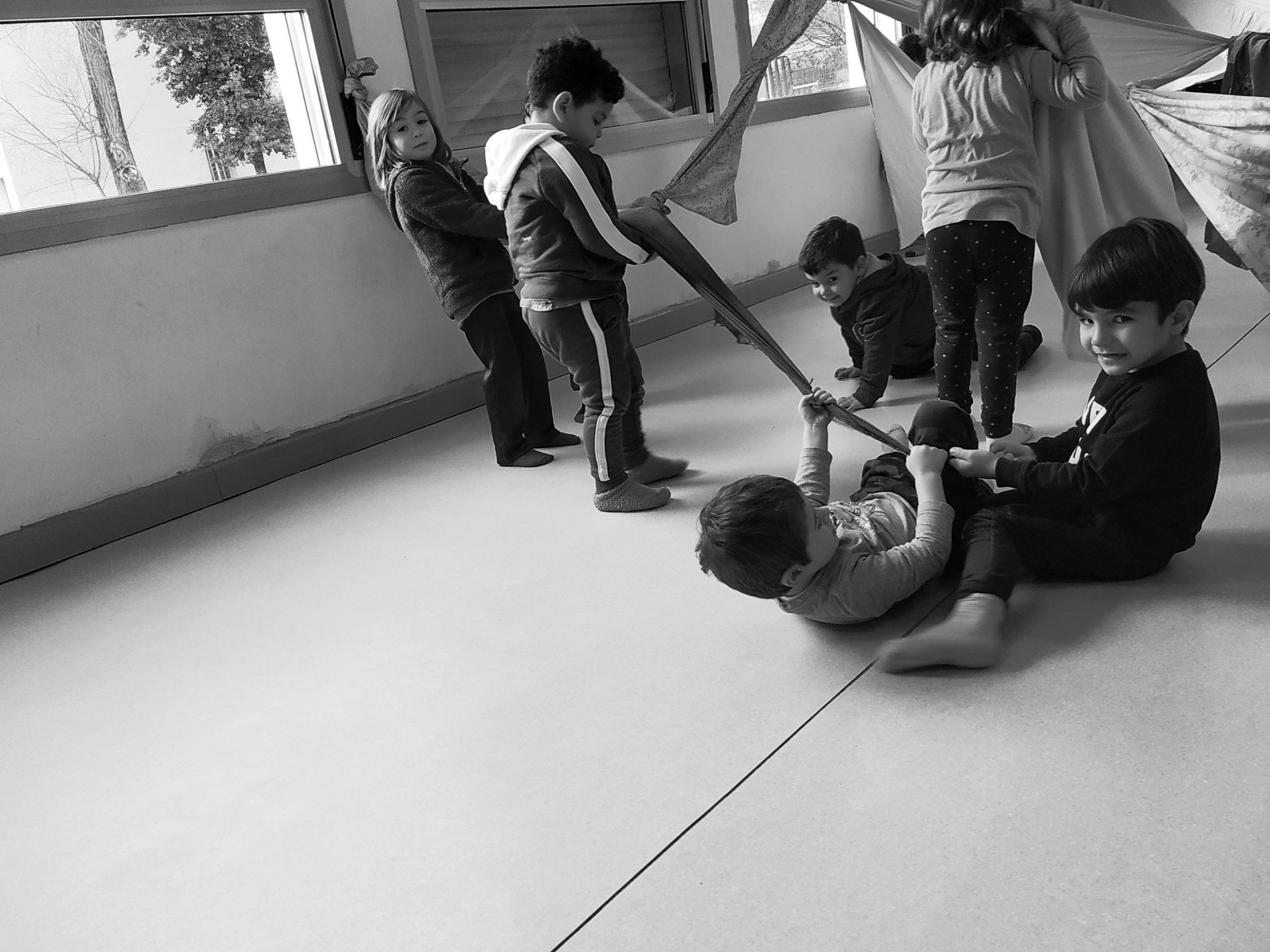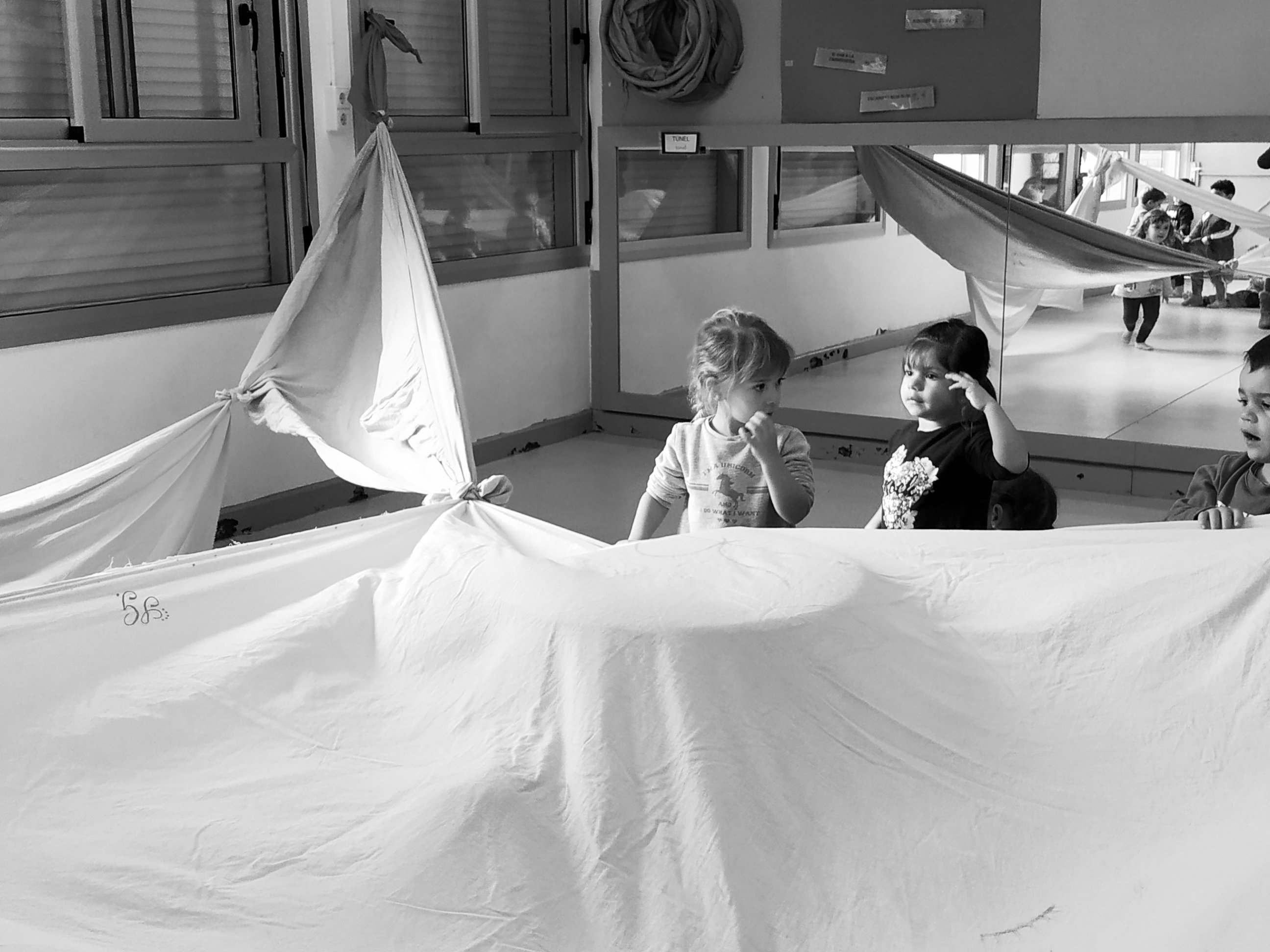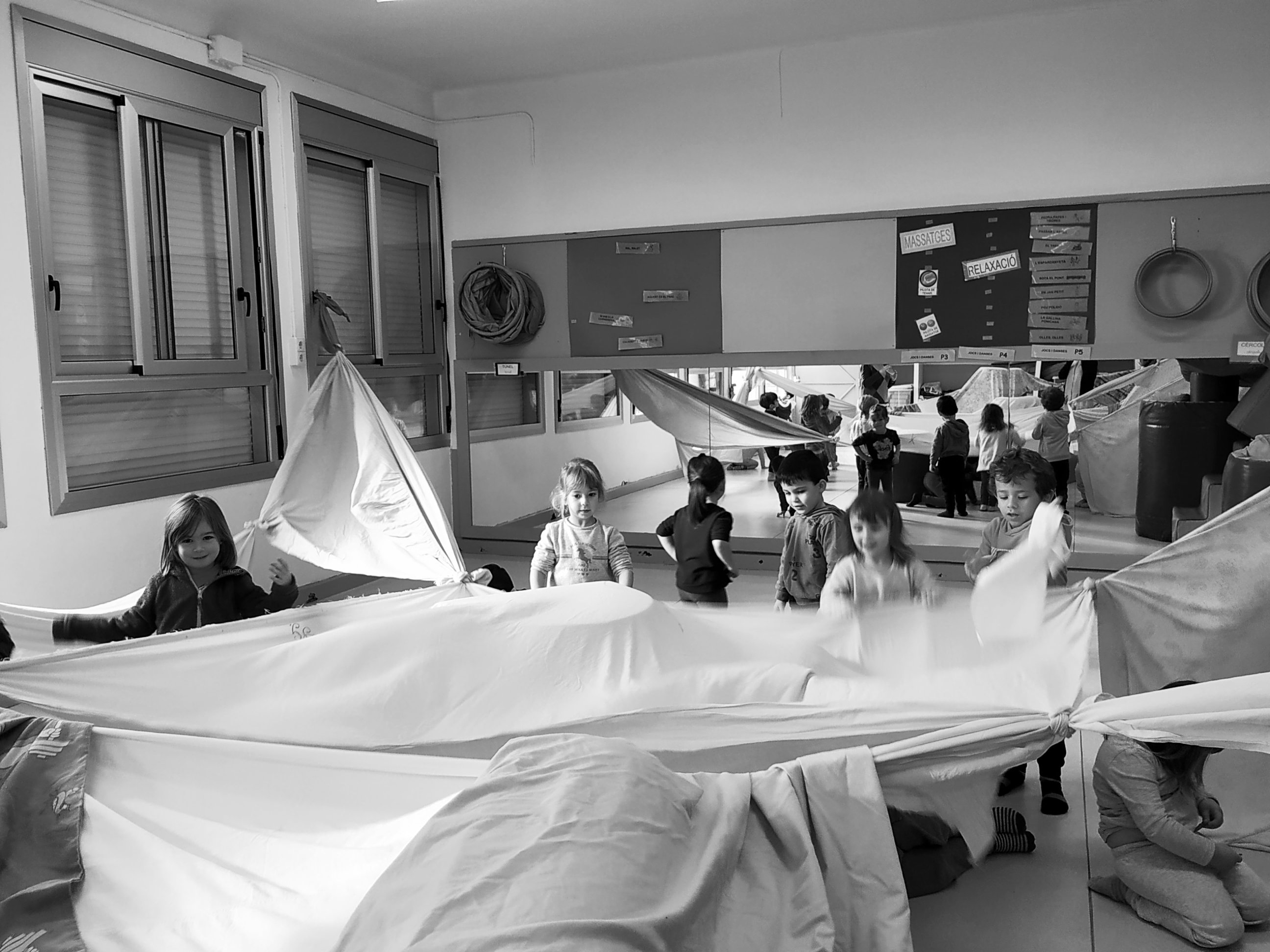 A la sessió de psicomotricitat d’aquesta setmana els infants de P3 hem experimentat amb teles. Ens ha agradat amagar-nos, fer cabanes i manipular-les.