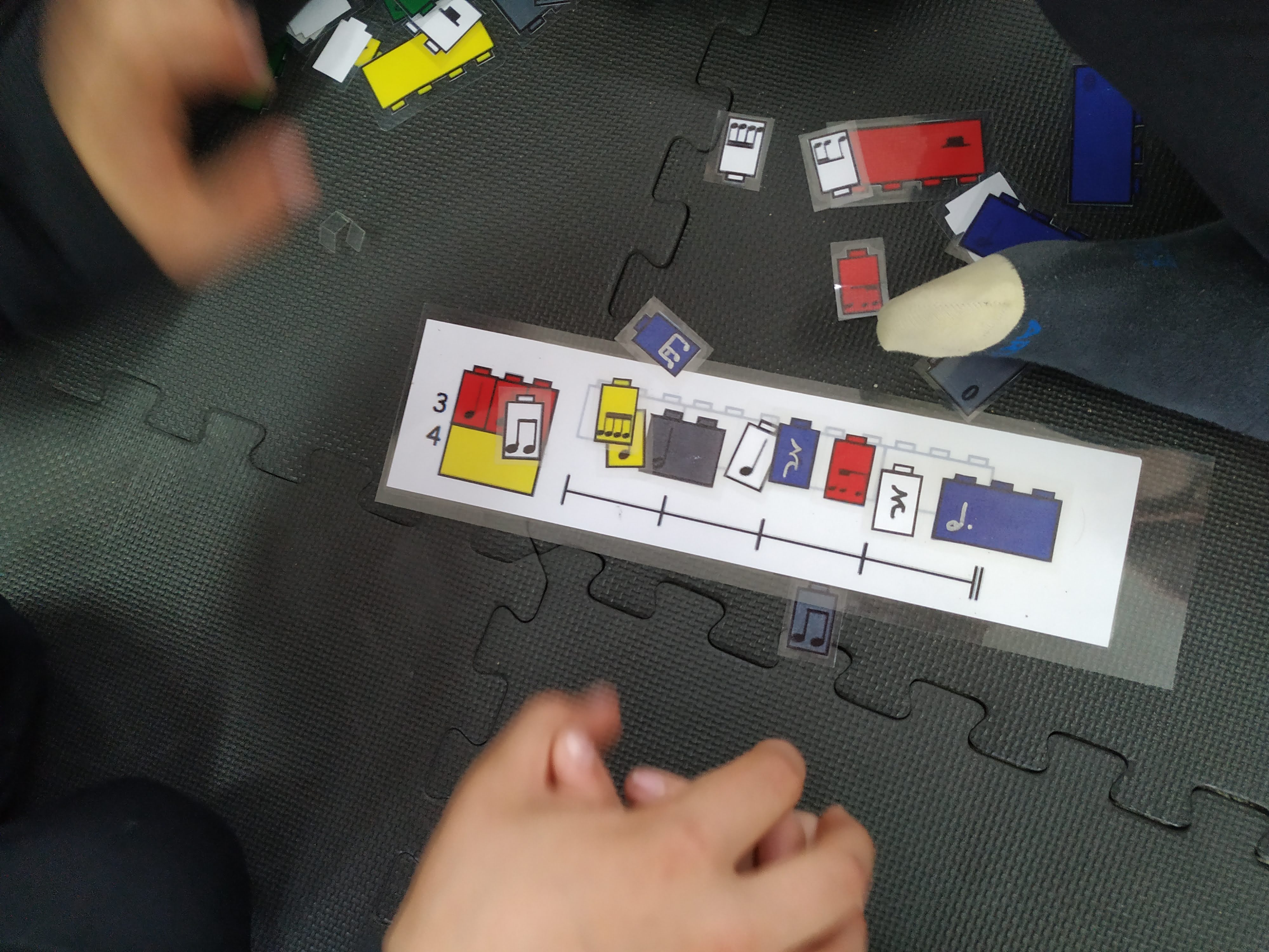 Primer vam començar inventant-nos un ritme de quatre compassos i aprofitant el compàs 3/4 que hem estat treballant. Ho fem manipulativament i quan el tenim clar el passem al paper.