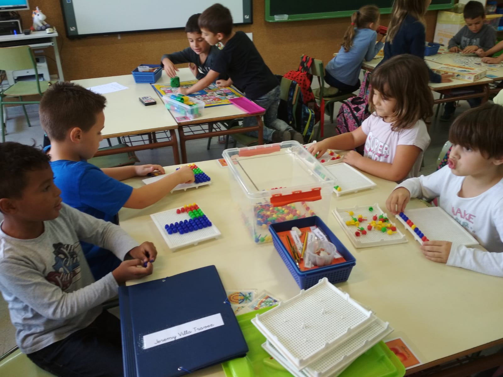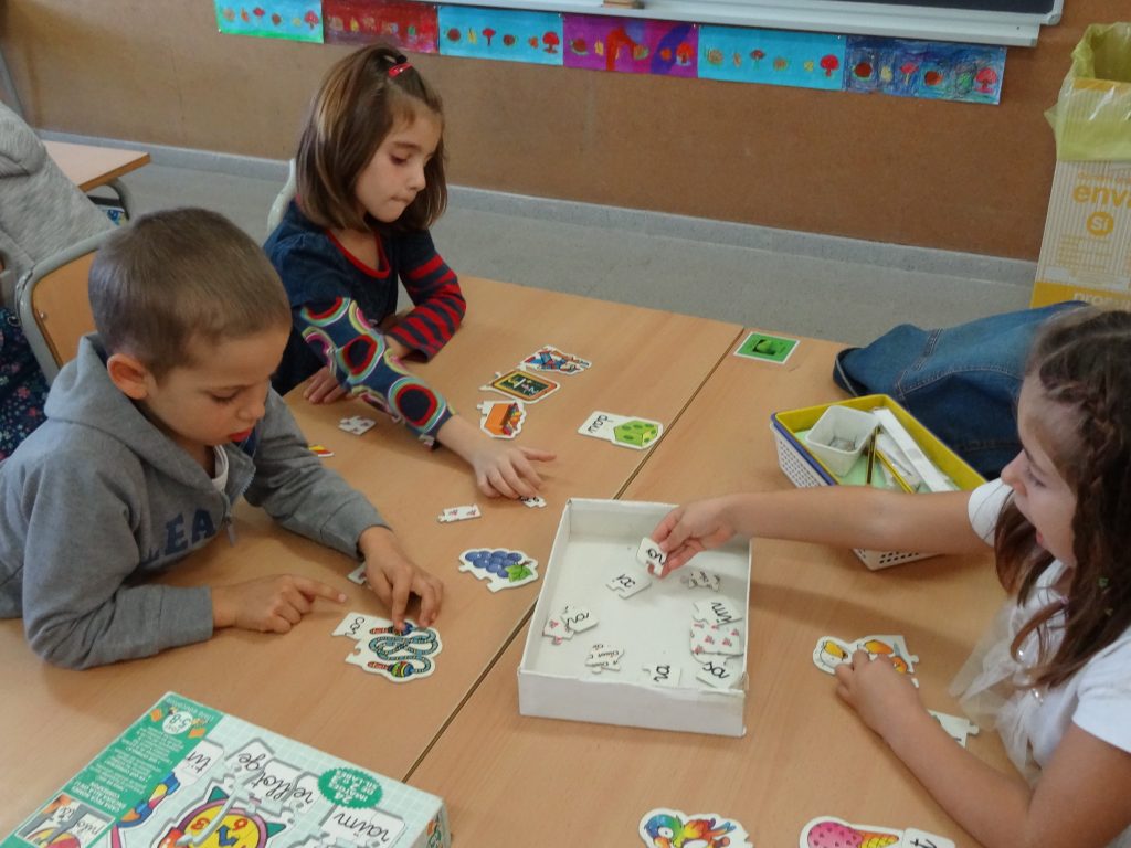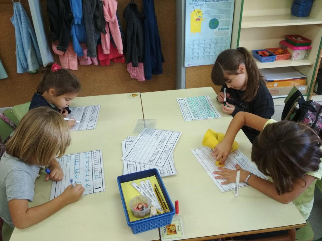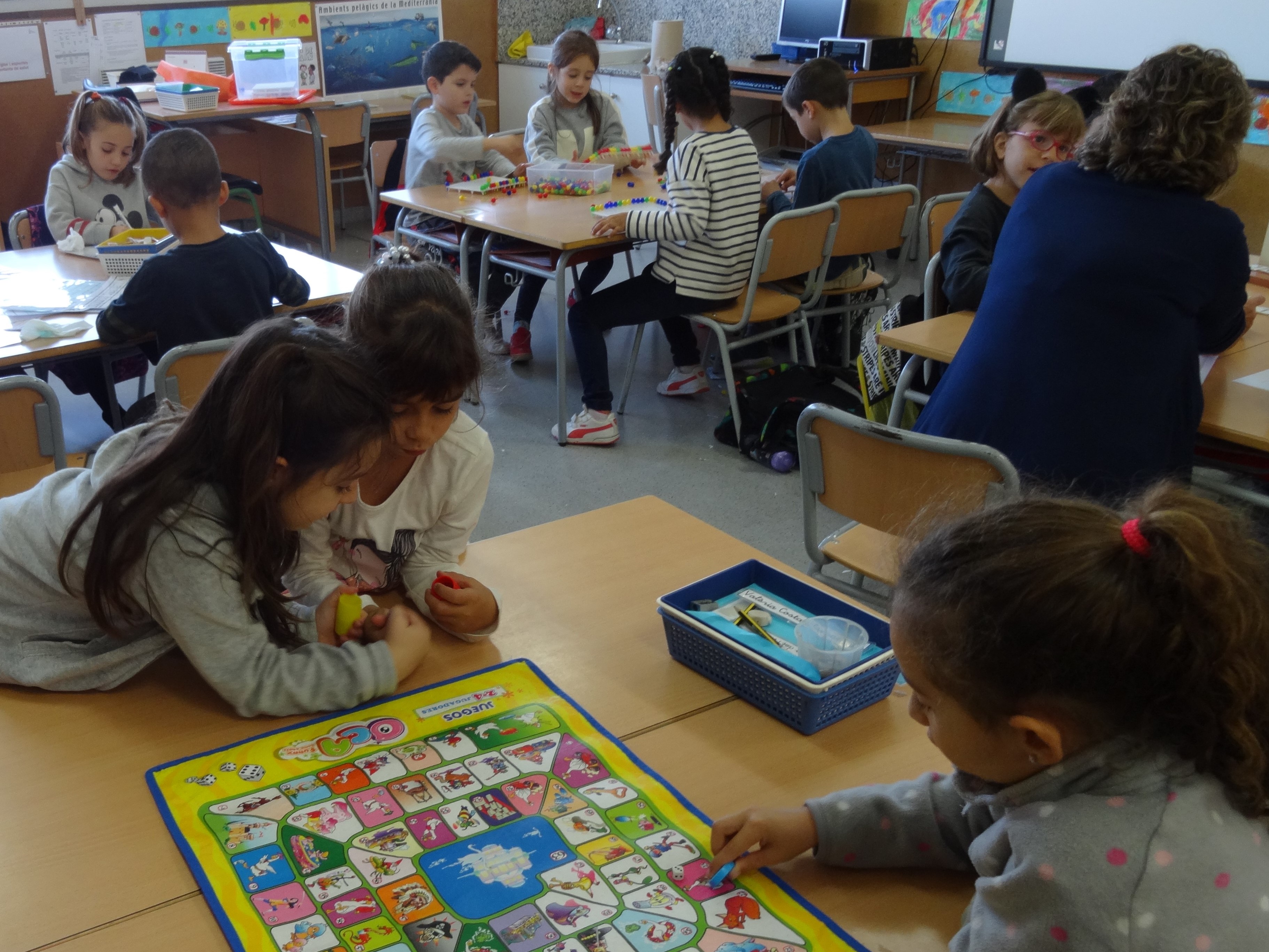 Cada grup de taula fa una activitat diferent, de caràcter manipulatiu, de manera autònoma, amb el suport de la mestra que va dinamitzant les actuacions.