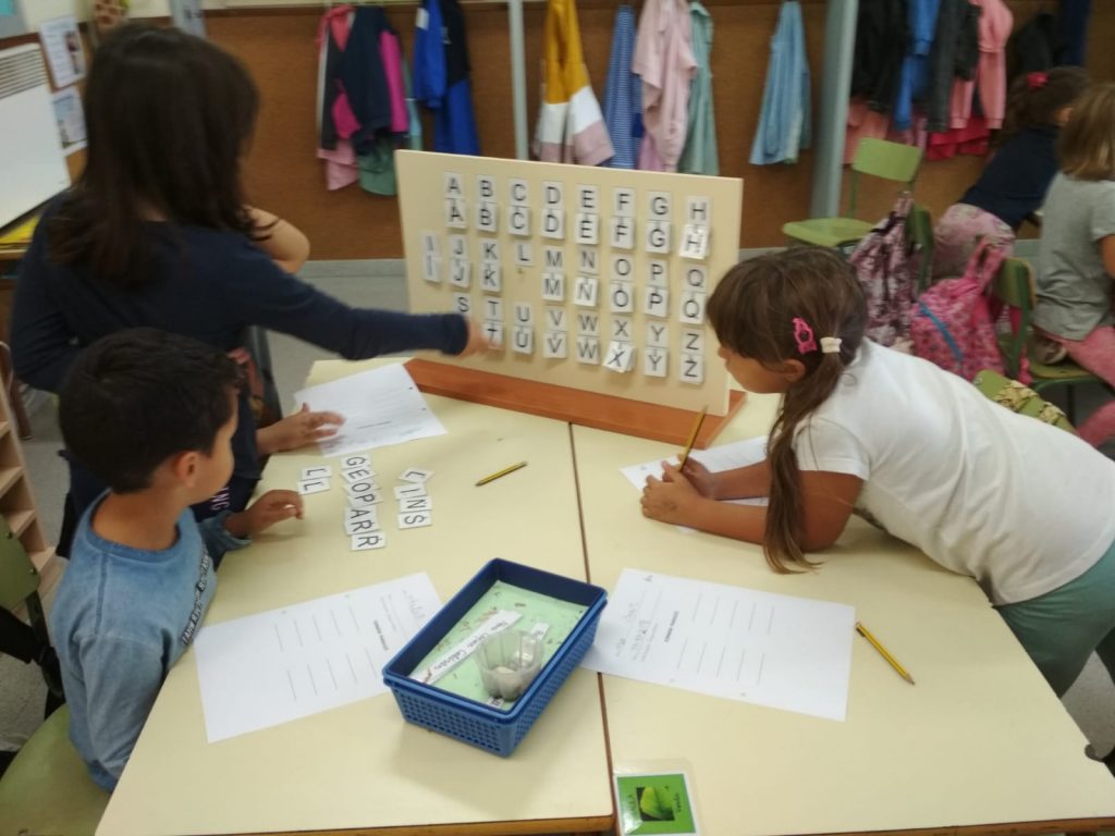 Hi ha dues mestres a l’aula. Hi ha racons de matemàtiques, de confegir paraules, de grafisme, jocs de taula,…