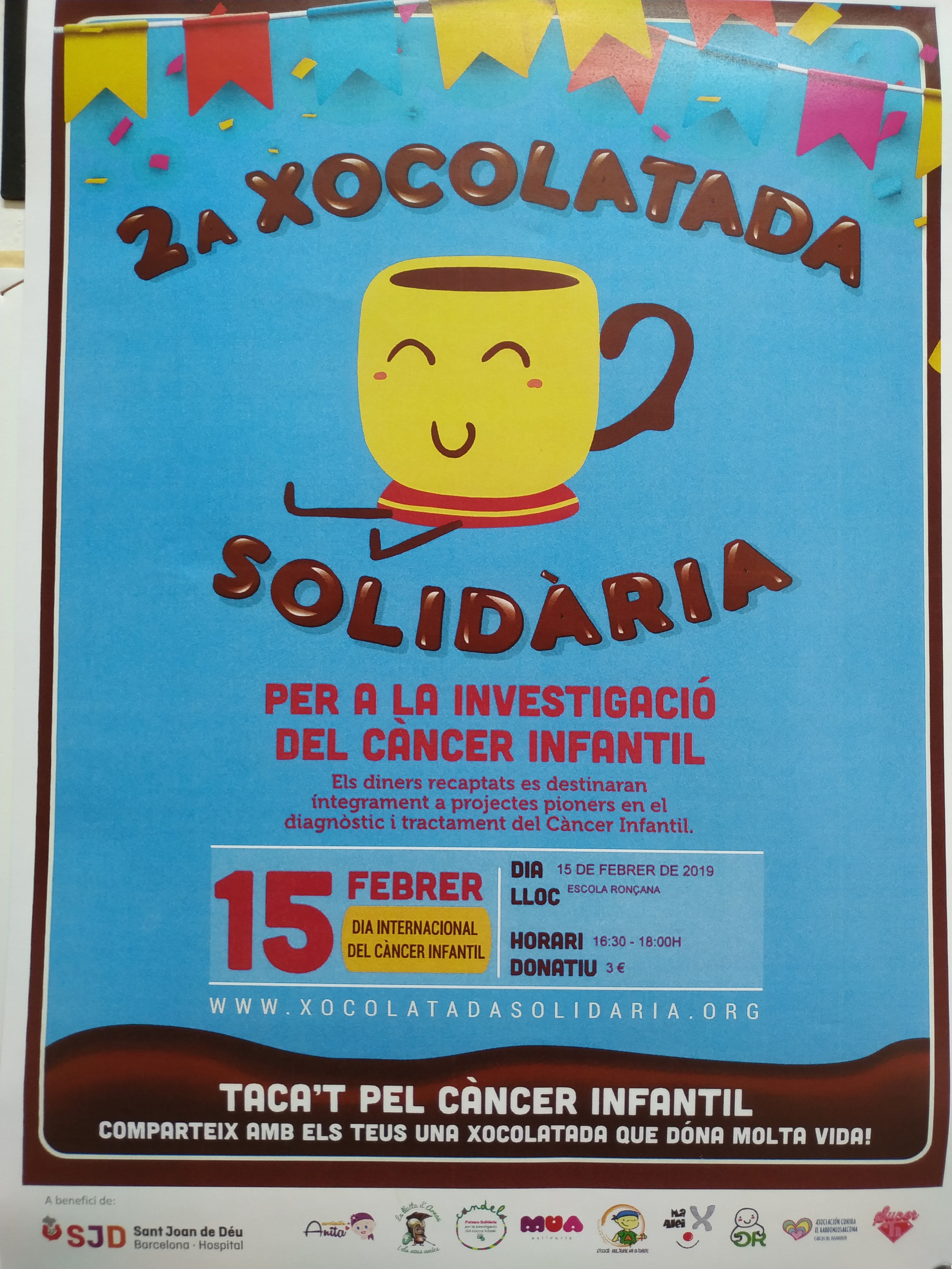 El divendres a la tarda us convidem a participar a la festa de la xocolatada solidària. Els diners recaptats serviran per a la investigació del càncer infantil.