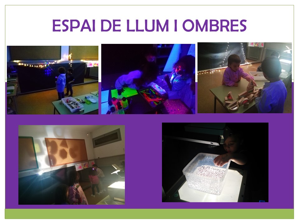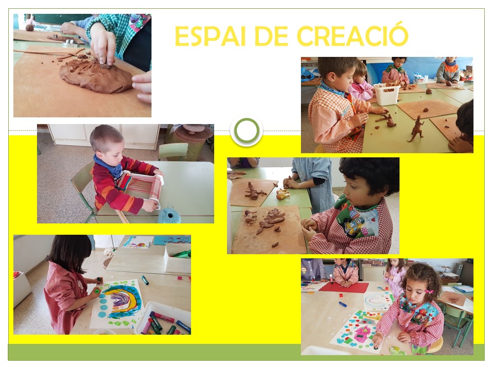 Els espais d’aprenentatge, creació i experimentació són un treball que consisteix en una manera diferent d’organitzar els alumnes, l’espai i els materials. Aquesta organització, que nosaltres anomenem espais, permet que cadascú pugui ser el protagonista i el constructor del seu propi aprenentatge. Cada espai propicia uns aprenentatges concrets i en general fomenten el desenvolupament d’habilitats d’autonomia i socialització. Com a Mestres organitzem i els observem, els acompanyem i actuem com a model lingüístic per aconseguir el seu creixement com a persones.