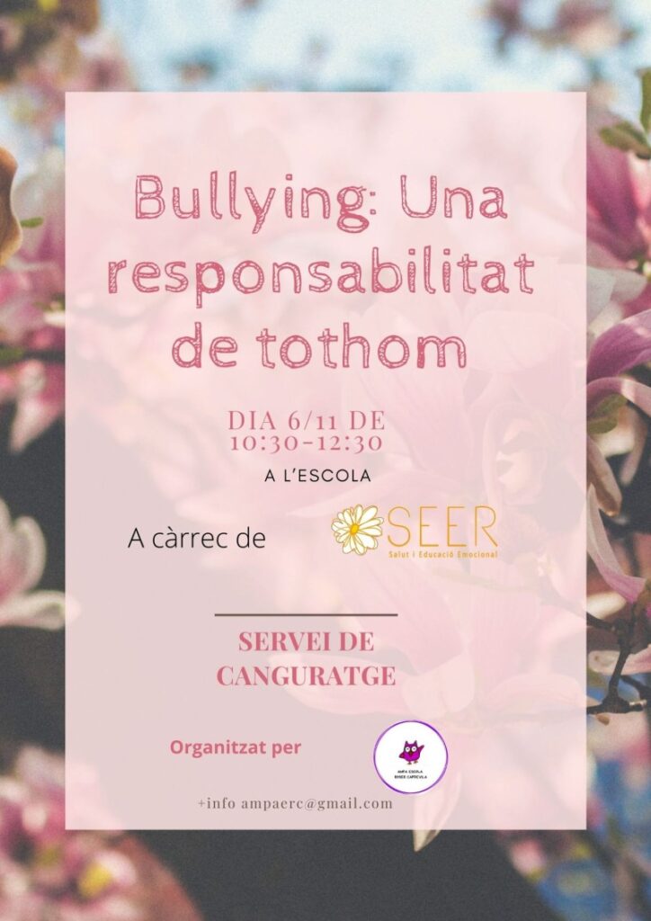 Bones famílies! La comissió d´educació emocional de l’Ampa us anunciem que el proper dissabte 6 de novembre de 10:30h a 12:30h tindrà lloc a l´escola el taller Bullying: Una responsabilitat de tothom. En aquest taller treballarem la prevenció, detecció i actuació davant de situacions d´assetjament escolar i veurem com l´educació emocional és un actiu clau en