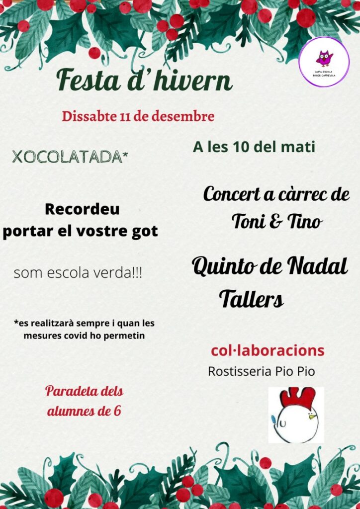 Benvolgudes famílies, S’acosta el dia que estàvem esperant! La festa d’hivern està de camí!!! El proper dissabte 11 de desembre a les 10 del matí gaudirem d’un matí de sorpreses per tothom. Us convidem que vingueu a passar una bona estona en família i amics. Hi haurà xocolatada (recordeu portar el vostre got), quinto, tallers