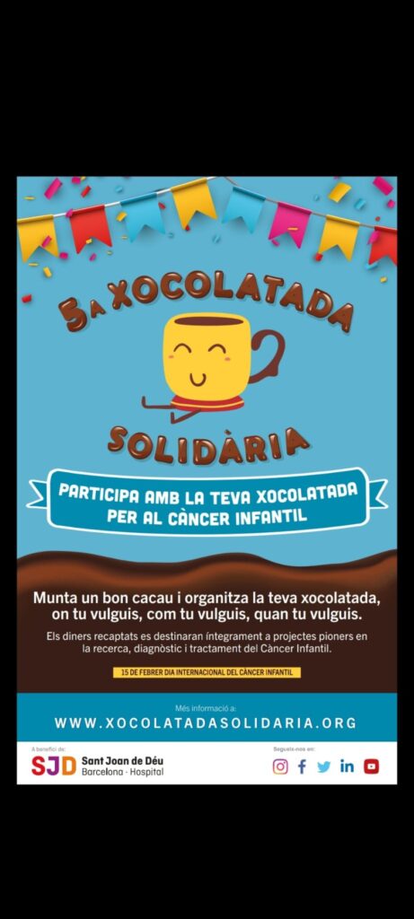 Atenció famílies! Des de l’AMPA, la comissió de festa, ens sumem a la campanya “5a xocolatada solidària” del Hospital Sant Joan de Déu, per a recaptar fons per a la investigació del Càncer Infantil El dia 22 d’Abril, celebrant la diada de Sant Jordi 🌹🐉 a les 16:30, MUNTAREM UN BON CACAU ☕!. Hi hauran guardioles perquè feu les vostres