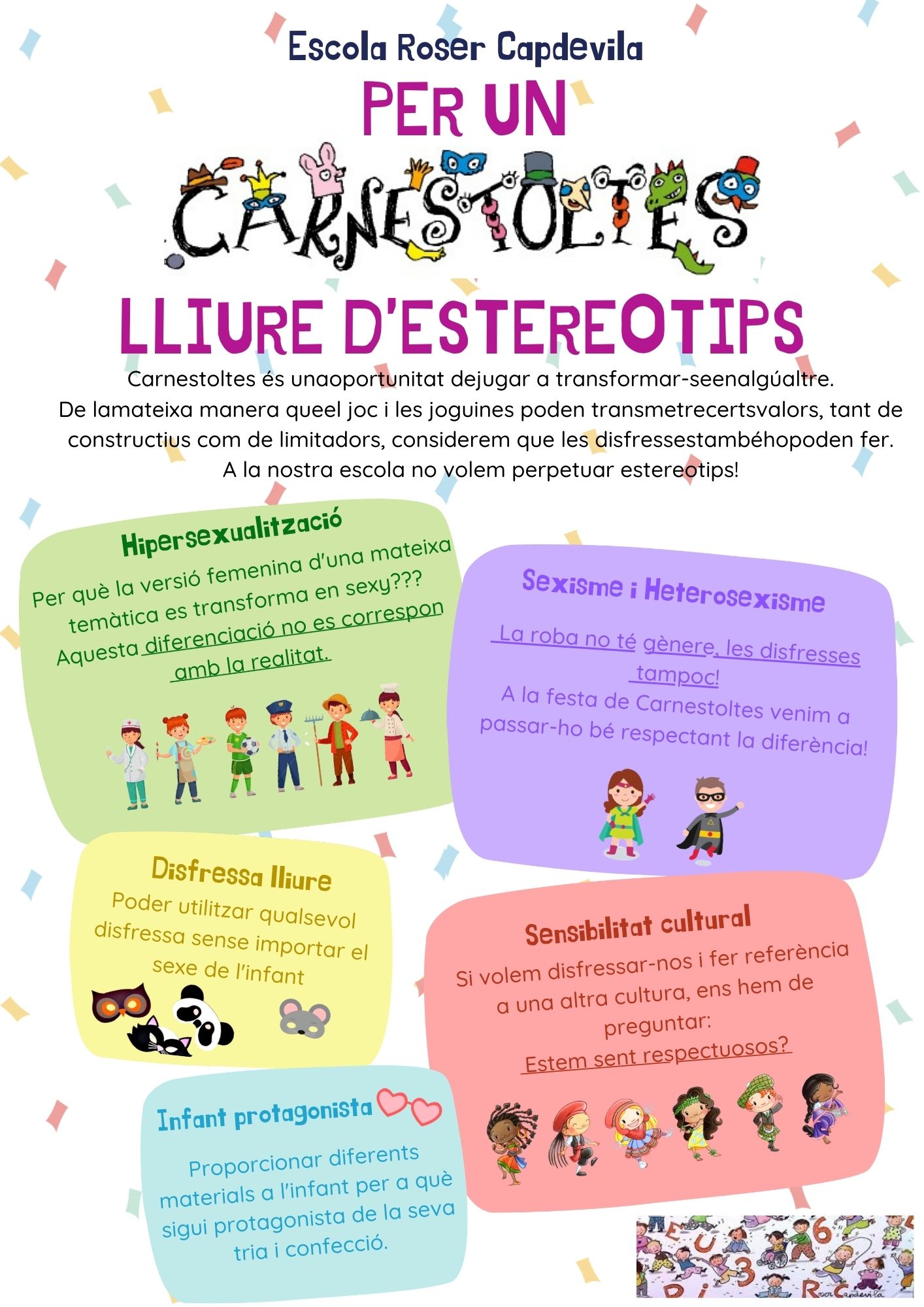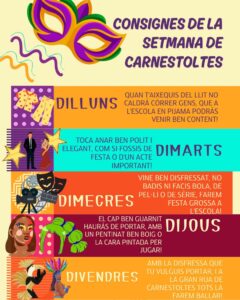 Animem els infants a escollir disfresses que els agradin de veritat, que representin els seus interessos i la seva imaginació, sempre des del respecte cap als altres. A l’escola celebrem la diversitat i entenem el Carnaval com una oportunitat per expressar-nos lliurement.