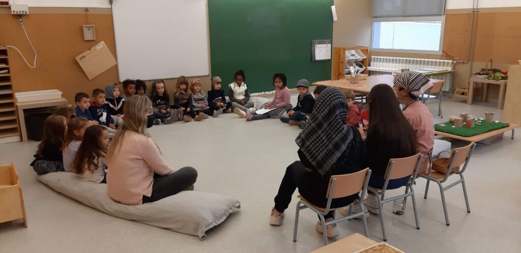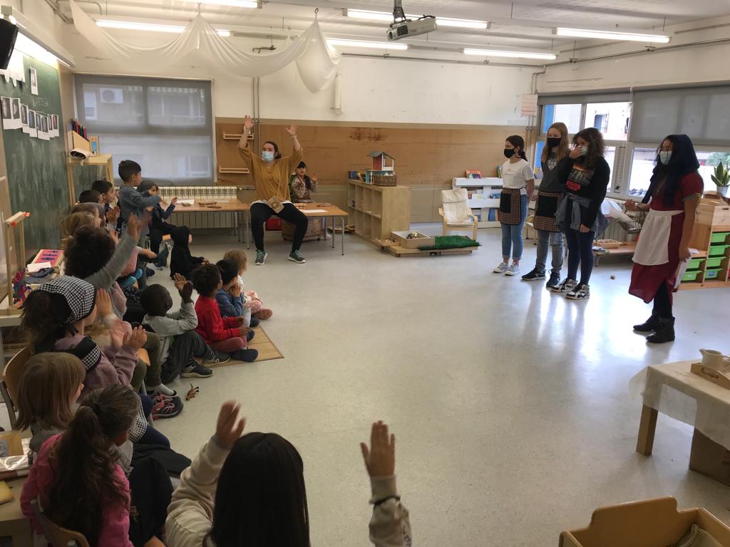 La comunitat de joves han vingut a les nostres aules a explicar-nos el conte de la castanyera als petits. Els infants han mostrat molt interès, han participat i l’han gaudit. Un cop han acabat d’explicar el conte hem anat a rentar mans i a menjar l’esmorzar especial de la castanyada.
