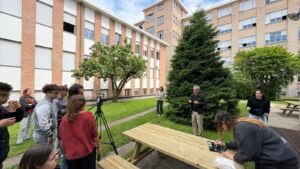 A continuació, proposa a l’alumnat fer una petita escena. Els alumnes s’organitzen per poder-la realitzar (actriu, responsable de llums, de càmera, director, claquetista, ajudants del set…). Després de diverses preses, baixen al jardí per rodar el fons i fer l’efecte del vent tot movent l’arbre.