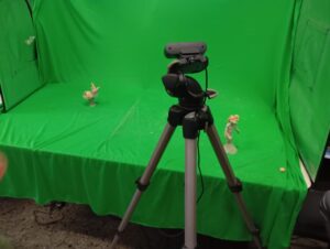 Then, he suggests that the students make a small scene. The students organize themselves to be able to make it (actress, lighting manager, cameraman, director, tap dancer, set assistants, etc.). After several takes, they go down to the garden to film the background and create the effect of wind by moving the tree.