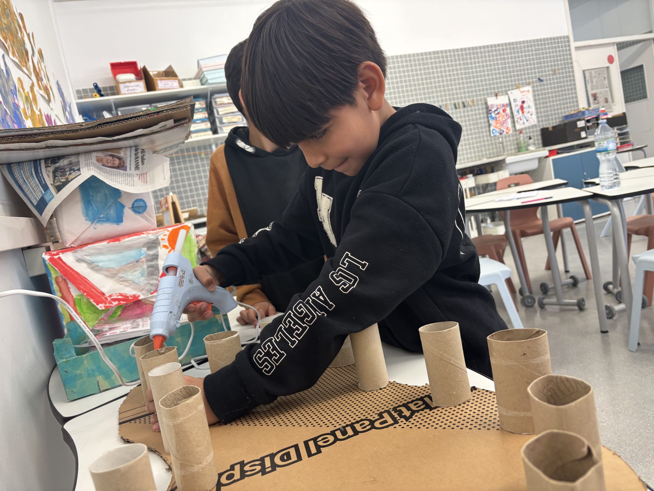 Alumne de 5è donant volum a la guitarra amb tubs de paper higiènic.