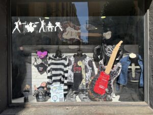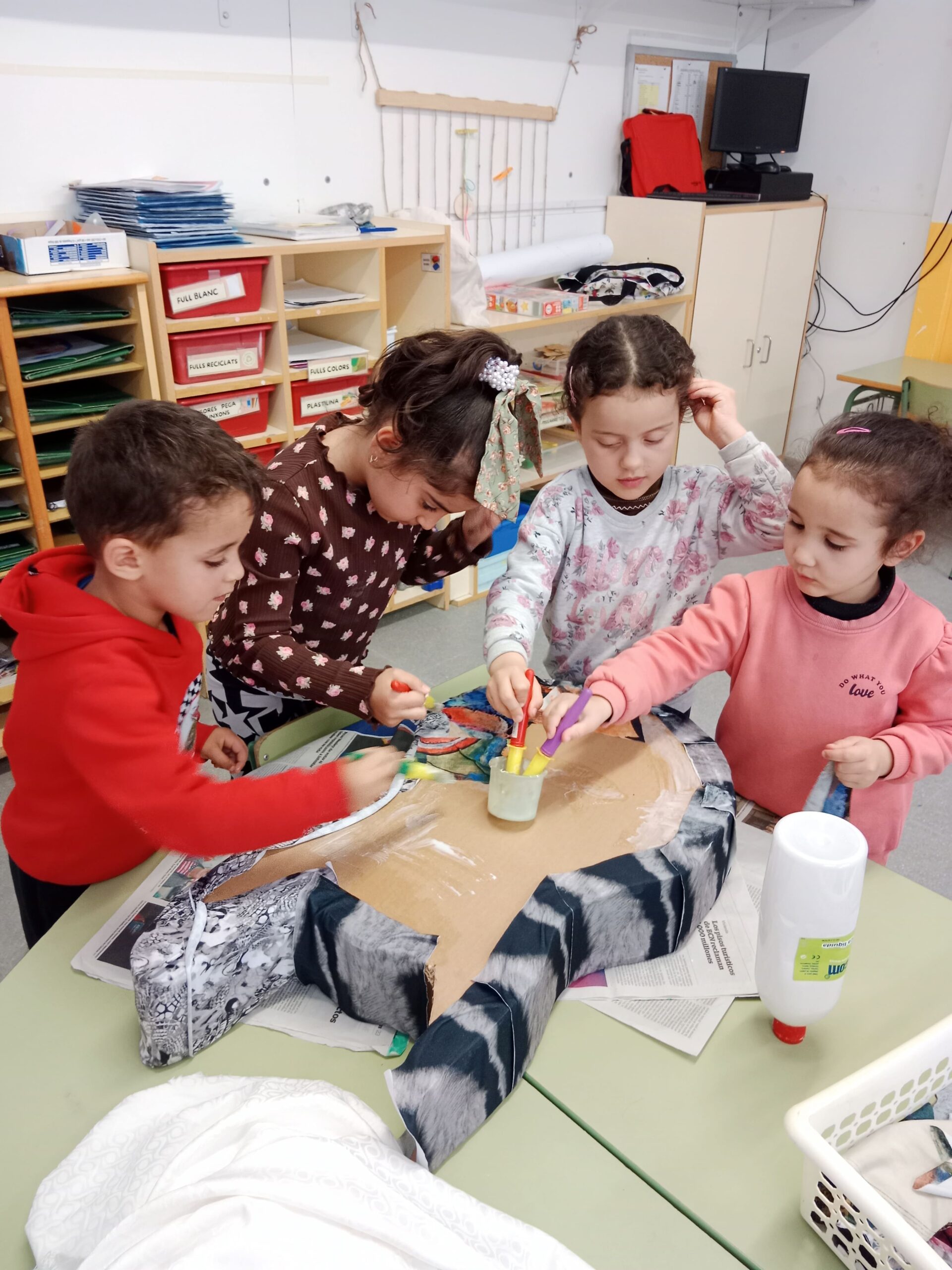 DESCRIPCIÓ DE L’OBRA: L’alumnat d’I4 i 5è de primària han construït 2 guitarres elèctriques amb material reciclat i roba, per guarnir l’aparador de la botiga Rockillos, fusionant el seu projecte de centre amb la línia de la botiga.
