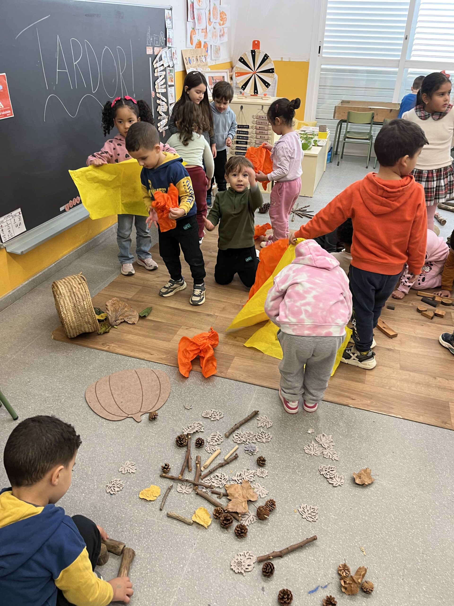 Per finalitzar el projecte de la tardor i tots els elements que l’han format, hem gaudit d’una estona molt especial on hem pogut interactuar amb els materials i compartir un moment màgic entre les dues classes. Hem descobert colors, formes i textures, i hem treballat diferents aspectes matemàtics com ara: gran–petit, gruixut–prim, afegir, treure, numeració, pes i volum, entre d’altres.