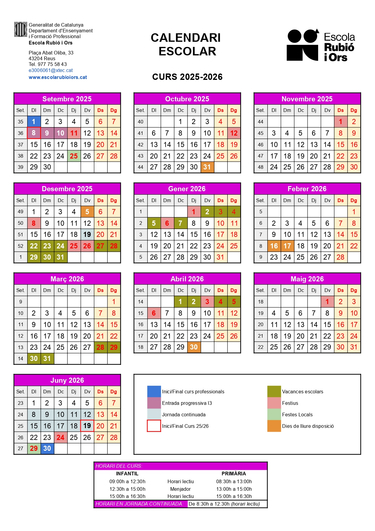- Primària: Matí de 8.30 a 13.00h. Tarda de 15.00 a 16.30h.