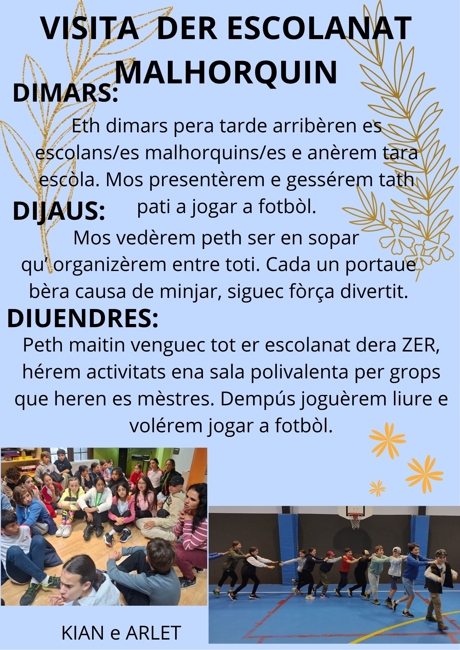 Eth passat dijaus, 22 de gèr de 2026, celebrèrem Sant Vicenç, eth patron des escolans. Pendent eth maitin, codinèrem e esdejoèrem crespèths ena nòsta classa. Dempús, convertirem era espasa en çò que volèrem. Finaument, ena vrespada, premanirem e presentèrem ua actuacion per grops internivèu. Mos ac passèrem fòrça ben!