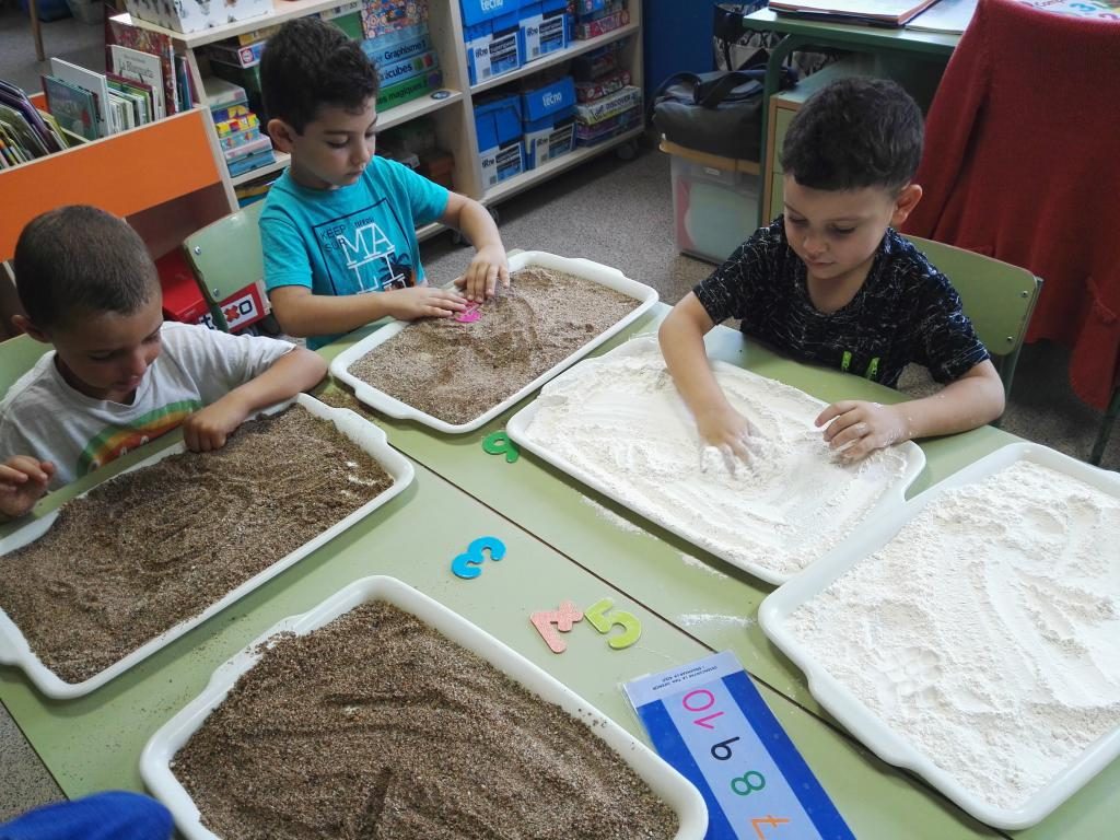 Per aprendre a escriure els nombres fem activitats de traç. Primer hem repassat la grafia dels nombres, tot seguit la Carme i la Lidia ens ha posat una plata amb sorra i farina on hi hem escrit els nombres amb el dit i quan hem acabat hem intentat reproduir els nombres amb plastilina de colors. Ens ho hem passat molt bé !!!!.