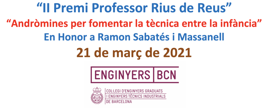 Enguany es celebren els II Premis “Professor Rius de Reus: Andròmines per a fomentar la tècnica entre la infància” en honor a Ramon Sabatés i Massanell organitzat pel Col·legi d’Enginyers Graduats i Enginyers Tècnics Industrials de Barcelona. Aquest certamen vol estimular la curiositat innata dels alumnes per aprendre. Les aportacions que han fet els alumne de cicle mitjà de l’escola han estat molt variades, ingenioses i creatives.