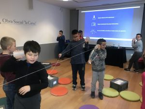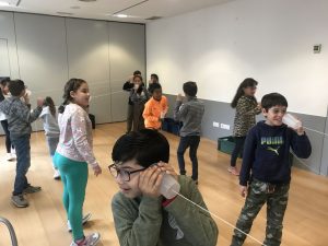 Primer, vam repassar com es produeix el so i com es propaga. Ho vam comprovar amb l’ajuda d’uns gots i uns cordills. Ens va recordar al telèfon que hem construït amb els iogurts a l’escola!