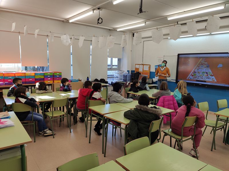 A continuació, ens ha projectat una imatge de la piràmide alimentària a la pissarra digital per explicar-nos els conceptes bàsics de la mateixa i fer una classificació de quin tipus d’aliments hem de consumir amb més freqüència i quins amb menys.