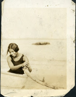 She was on a boat on a lake. She had a bun and she had a black dress. She was happy. She was on holiday and she had a stick.