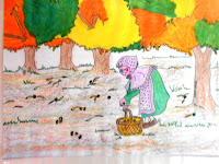I en aquell mateix instant es va adonar del seu error, enlloc de castanyes havia collit cargols. Hi havia tots els cargols del cistell passejant per allà, n’hi havia per tot arreu: per terra, a la seva caseta, a la seva cadira, … Llavors la vella castanyera va pensar que hauria de tornar al bosc a collir castanyes per poder-les vendre.