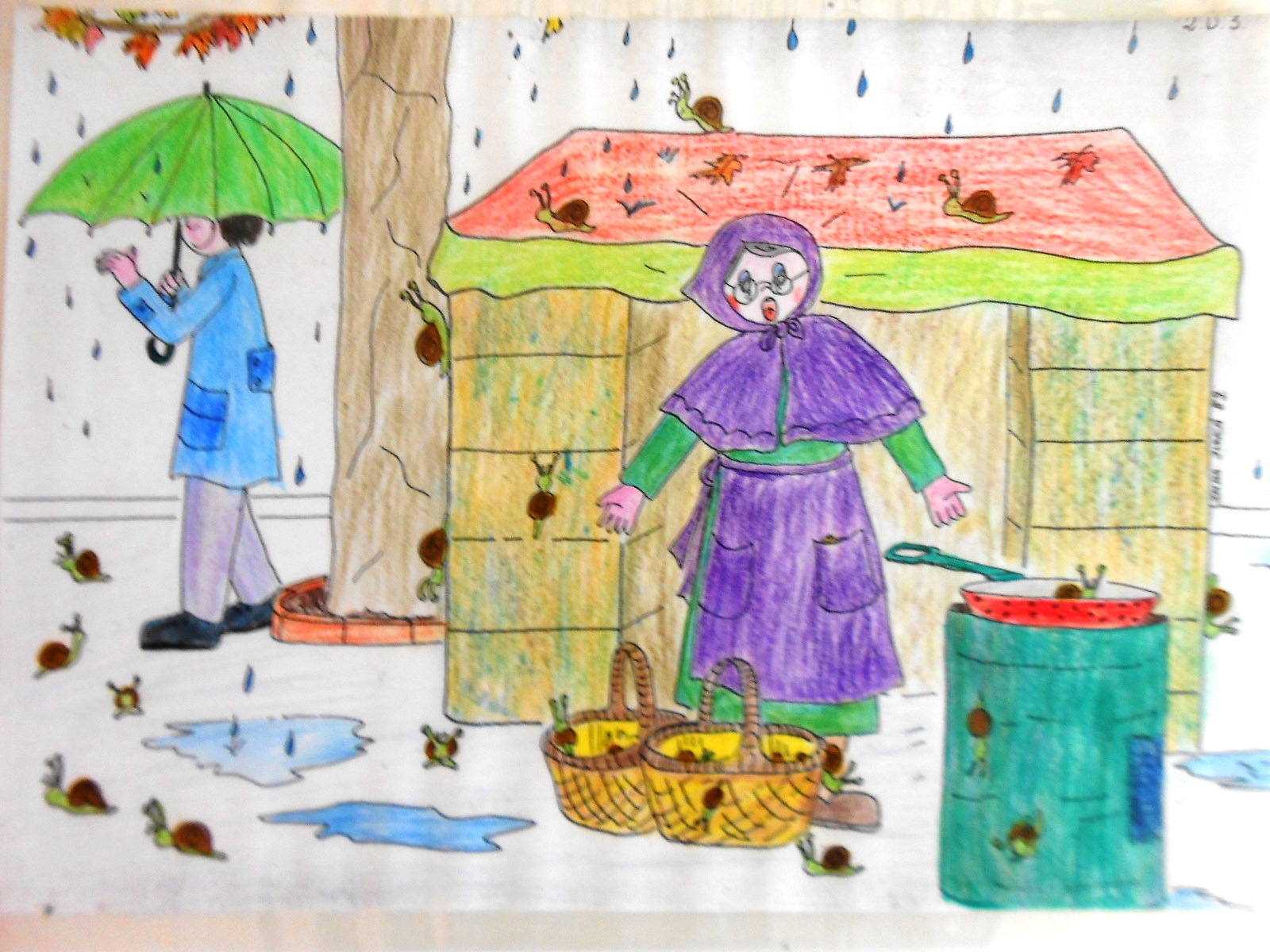 I en aquell mateix instant es va adonar del seu error, enlloc de castanyes havia collit cargols. Hi havia tots els cargols del cistell passejant per allà, n’hi havia per tot arreu: per terra, a la seva caseta, a la seva cadira, … Llavors la vella castanyera va pensar que hauria de tornar al bosc a collir castanyes per poder-les vendre.