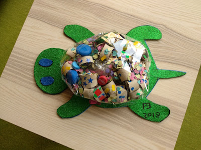 Una tortuga, la seva mascota feta amb taps de plàstic, gomets, serpentines i  tubs de paper de vàter, el material reciclat que més s’utilitza per fer manualitats divertides.