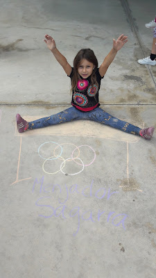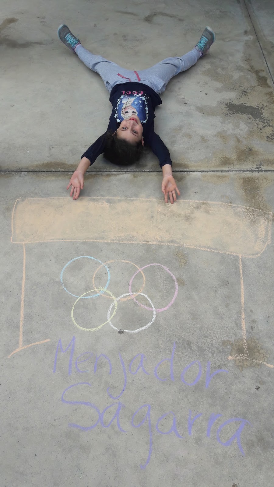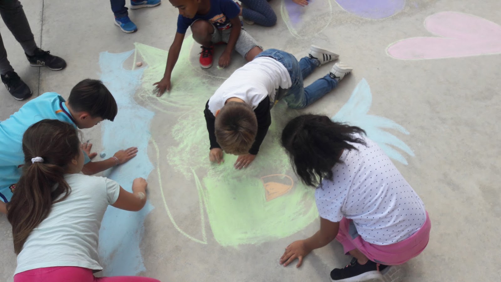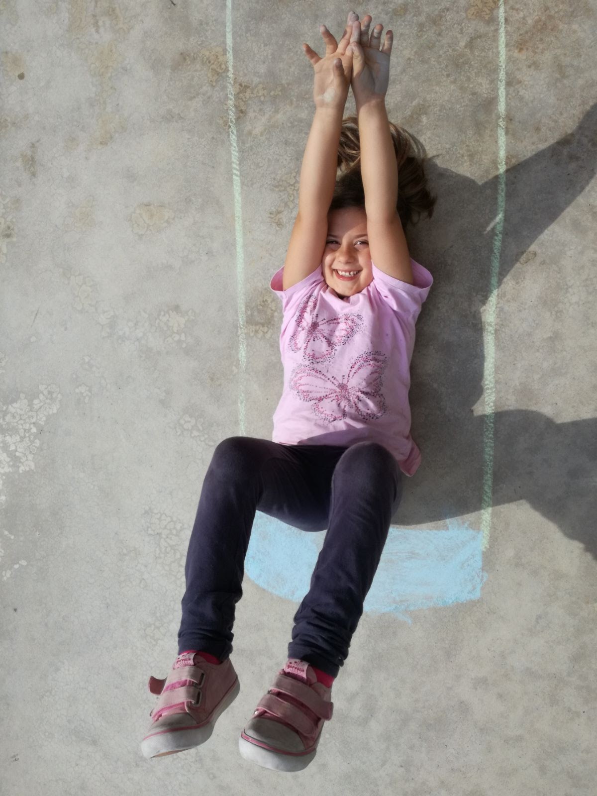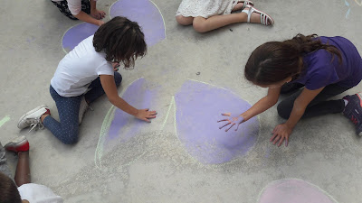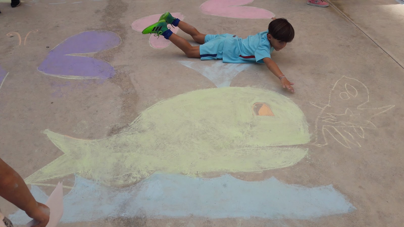 Objectiu: dibuixar amb guix en grans dimensions i sobre un suport no convencional com és el terra del pati de primària. Finalment incorporem el propi cos al dibuix i fem una fotografia.