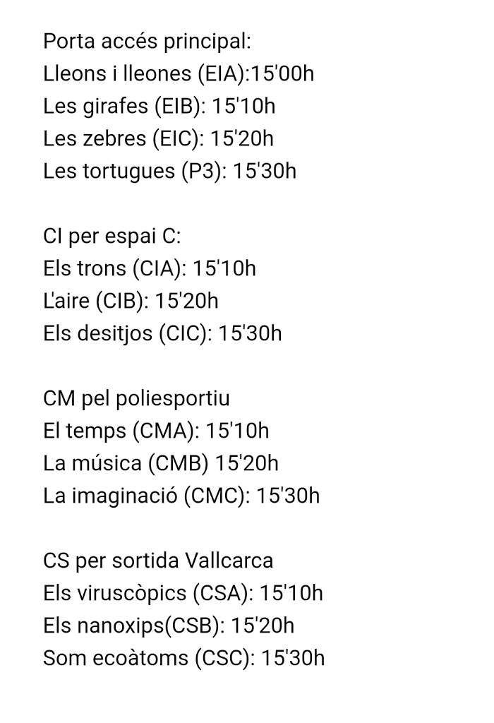 Dilluns 21, horari espai migdia Feu un comentari / Per Menjador / 19 de desembre de 2020 / Temps educatiu de migdia A la porta principal l’acompanyant referent serà la Maria de P3. A la porta de l’espai C, l’Aldara. Pel poliesportiu la MªÀngels. I per sortida Vallcarca la Nuri. Preguem puntualitat, moltes gràcies!!