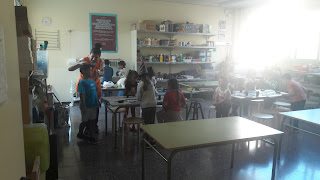 l’Andrea monitora de 1r a les taules de pícnic amb 1r i 2n pintant i escollint els dibuixos que més agraden per decorar el nostre menjador.