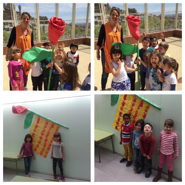 Els nostres petits de P4 i P5 amb la MªÀngels i la Mireia han fet una “Gran Rosa de Sant Jordi” i La Senyera, pintada amb les seves manetes…
