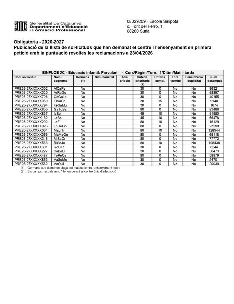 • PREINSCRIPCIÓ: LLISTAT RESOLTES LES RECLAMACIONS