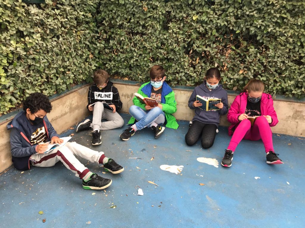 Els alumnes i les alumnes de cinquè aprofitem que encara fa bon temps per llegir al pati