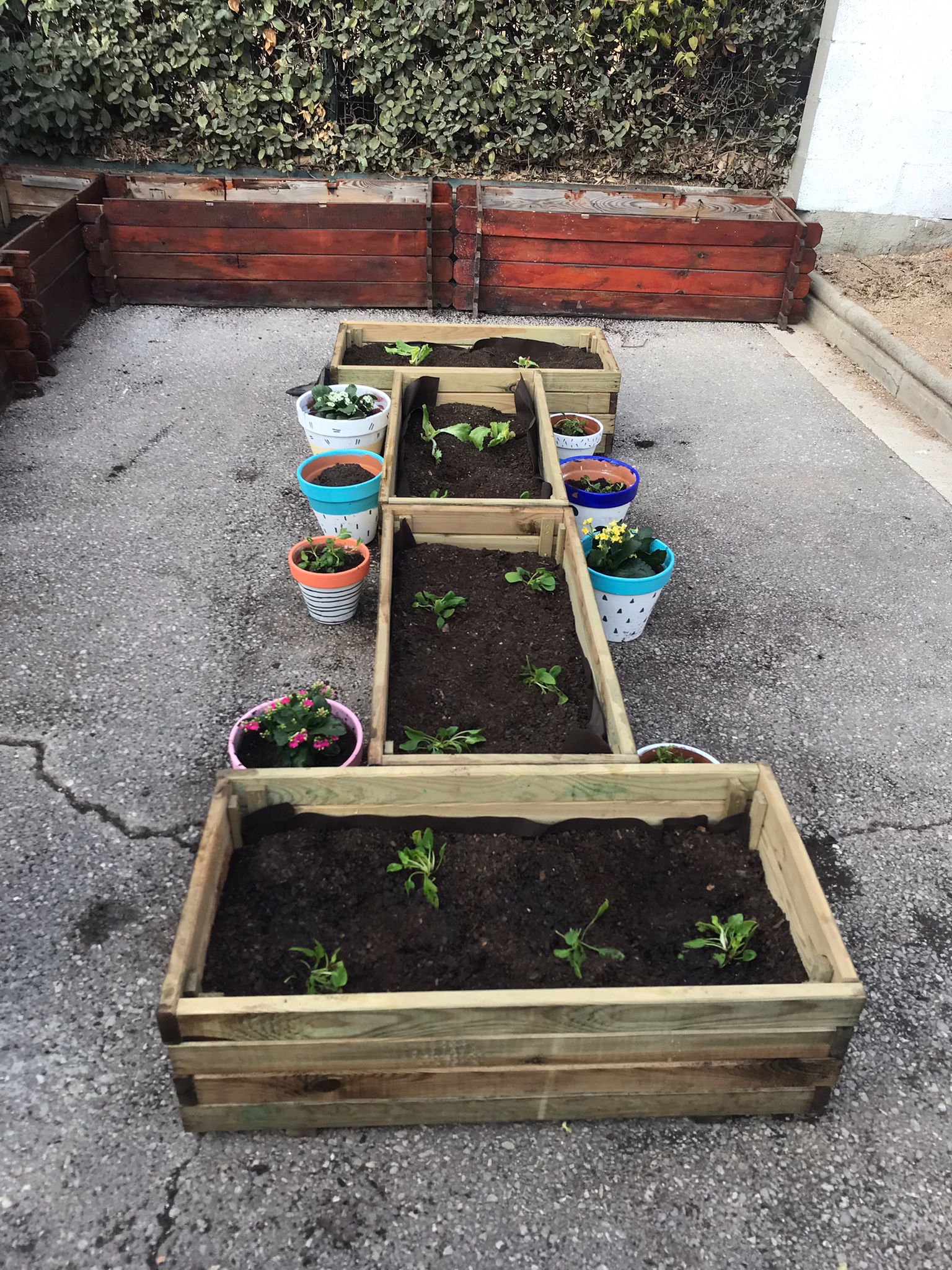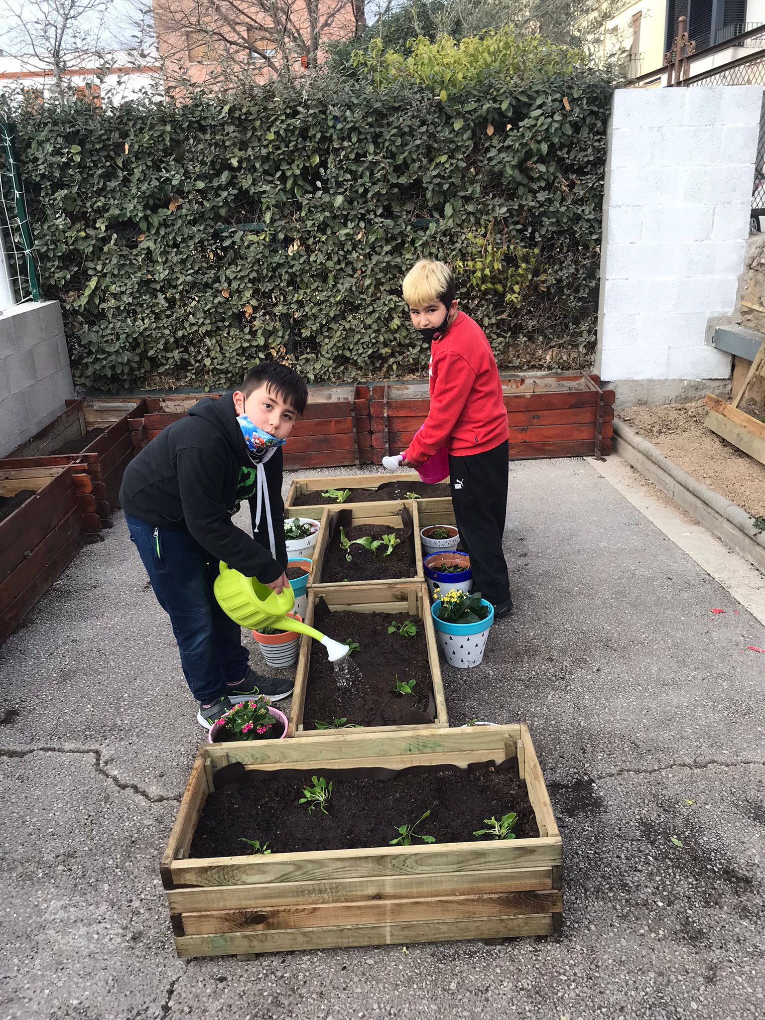 Estem molt contents i contentes! El nostre hort, que tant va patir amb l’arribada del “Filomena”, comença ja a tenir forma. Ja hem posat testos i hem començat a plantar enciams, canonges, menta i una planta de colors!