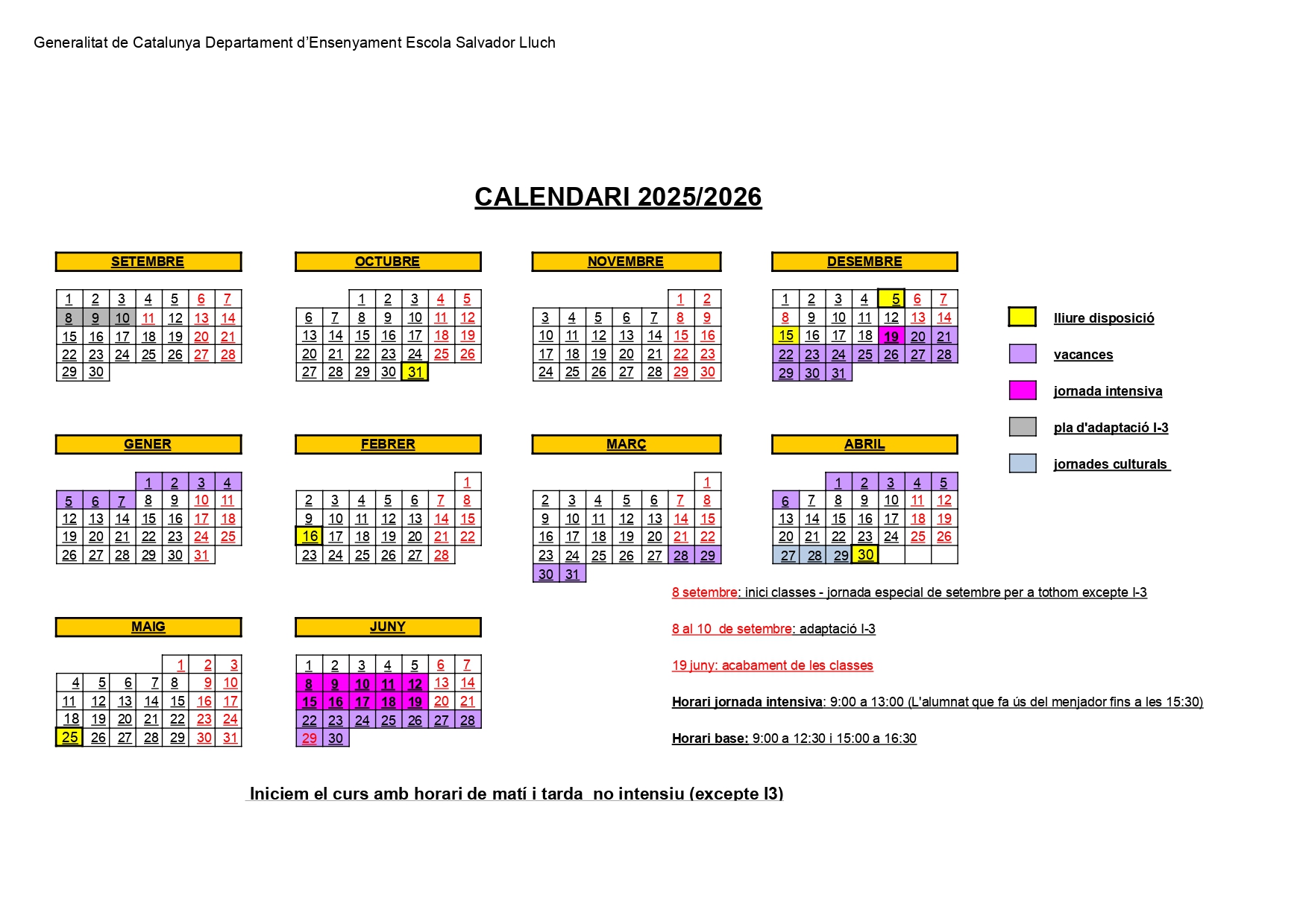 El curs comença el 8 de setembre i acaba el 19 de Juny