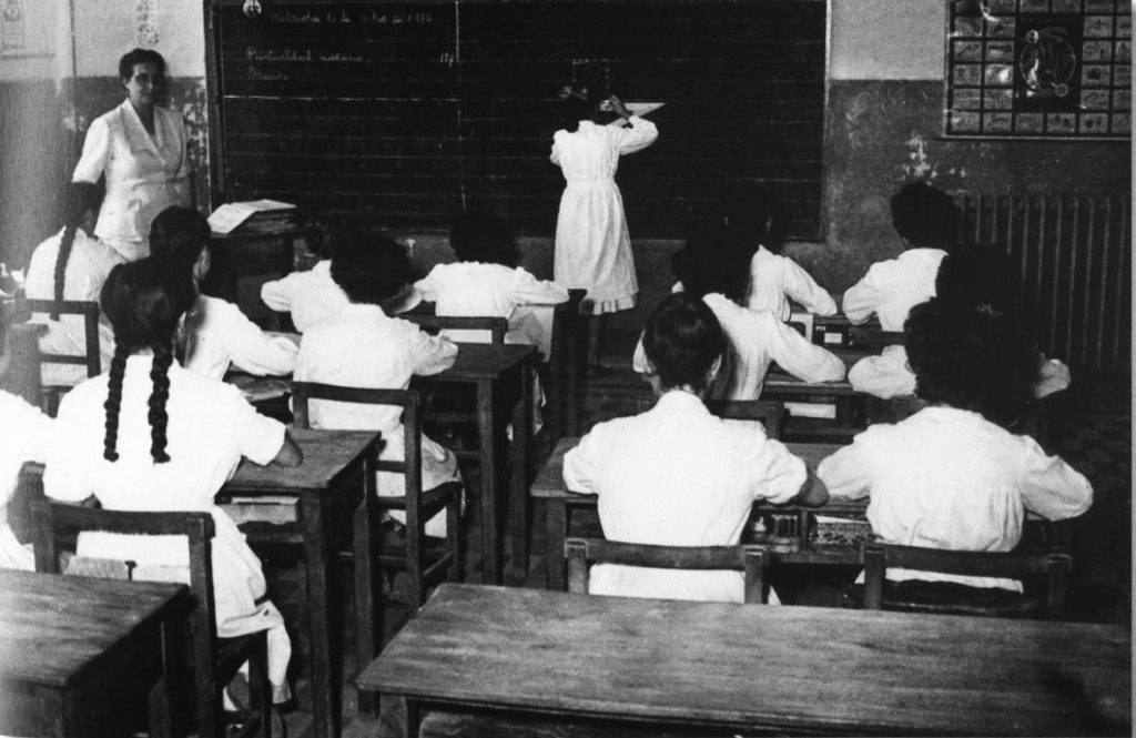 Durant aquests primers anys l’escola tenia nois i noies: les noies a la planta baixa i els nois al primer pis. La generació que es formà durant aquests anys, protagonitzaria més tard el ressorgiment cultural i democràtic dels anys seixanta a través del periòdic Brugués, del Centre Cultural i d’altres entitats de la localitat.