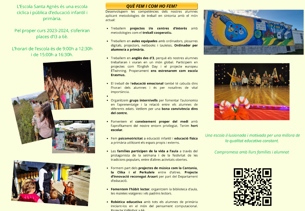 L’ESCOLA SANTA AGNÈS ÉS UNA ESCOLA D’INFANTIL I PRIMÀRIA CÍCLICA, PÚBLICA, CATALANA I LAICA QUE ES DEFINEIX COM A INCLUSIVA I RESPECTUOSA AMB LA PLURALITAT, TRETS DEFINIDORS DEL SEU CARÀCTER PROPI.