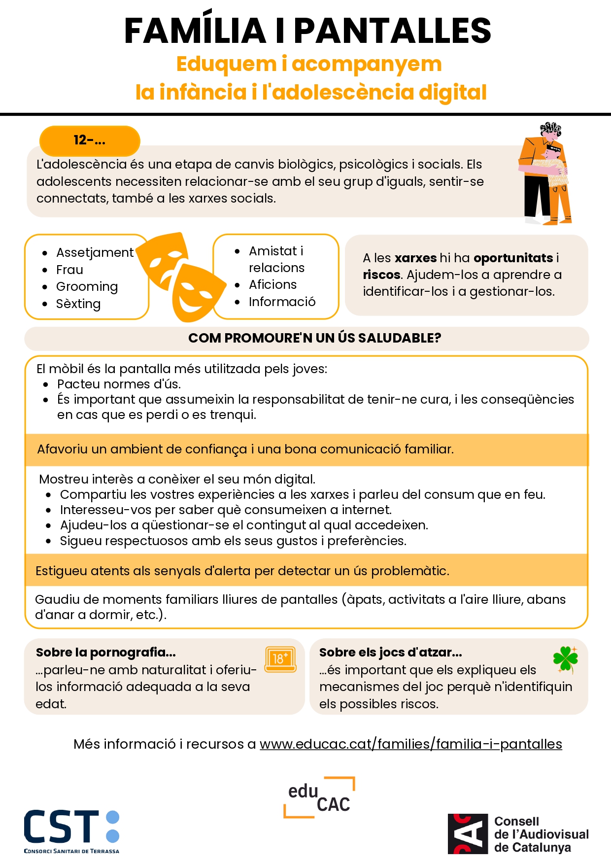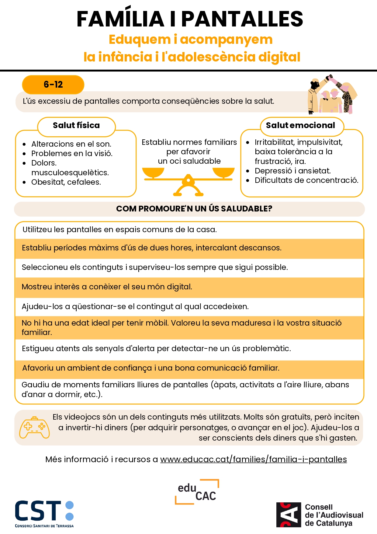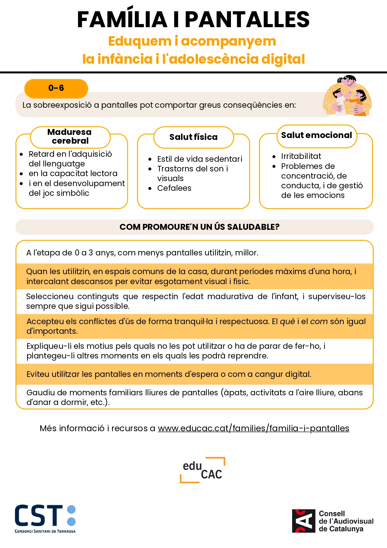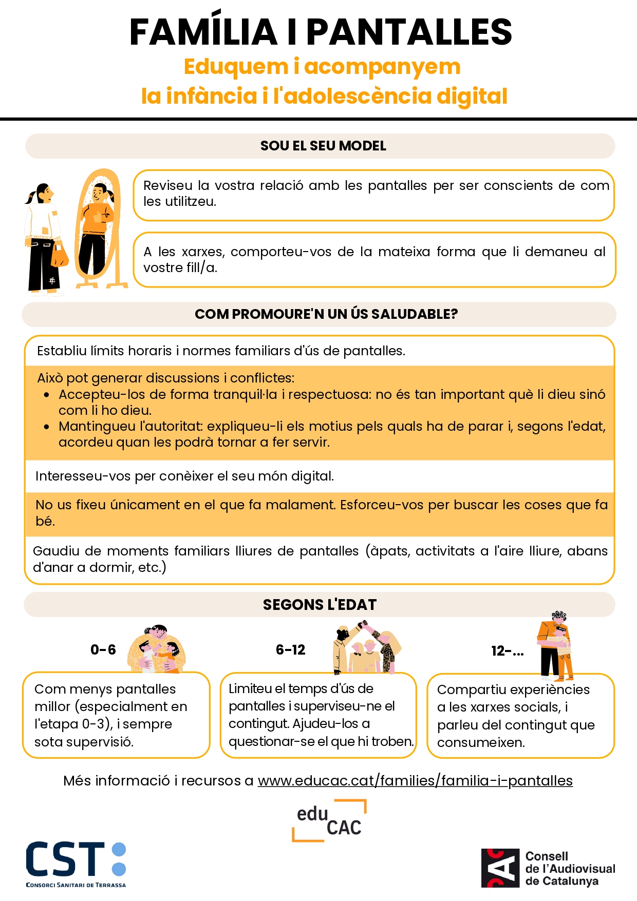Des del centre volem compartir amb vosaltres recursos i orientacions sobre l’ús de les pantalles en l’àmbit familiar. La informació i les infografies que trobareu en aquesta pàgina estan basades en els materials publicats per eduCAC, dins l’apartat Família i pantalles, un espai amb recursos específics per acompanyar infants i adolescents en l’educació digital.