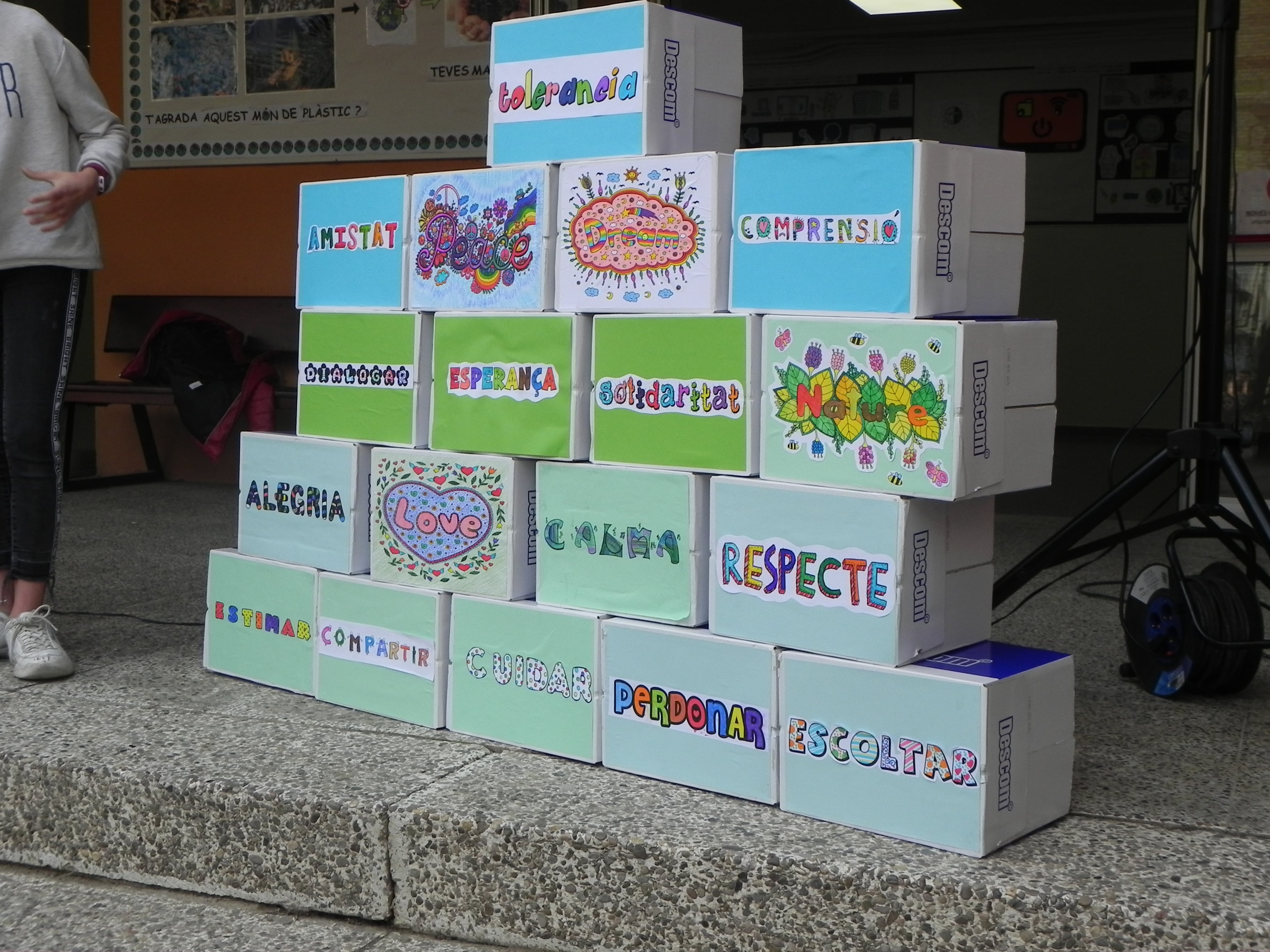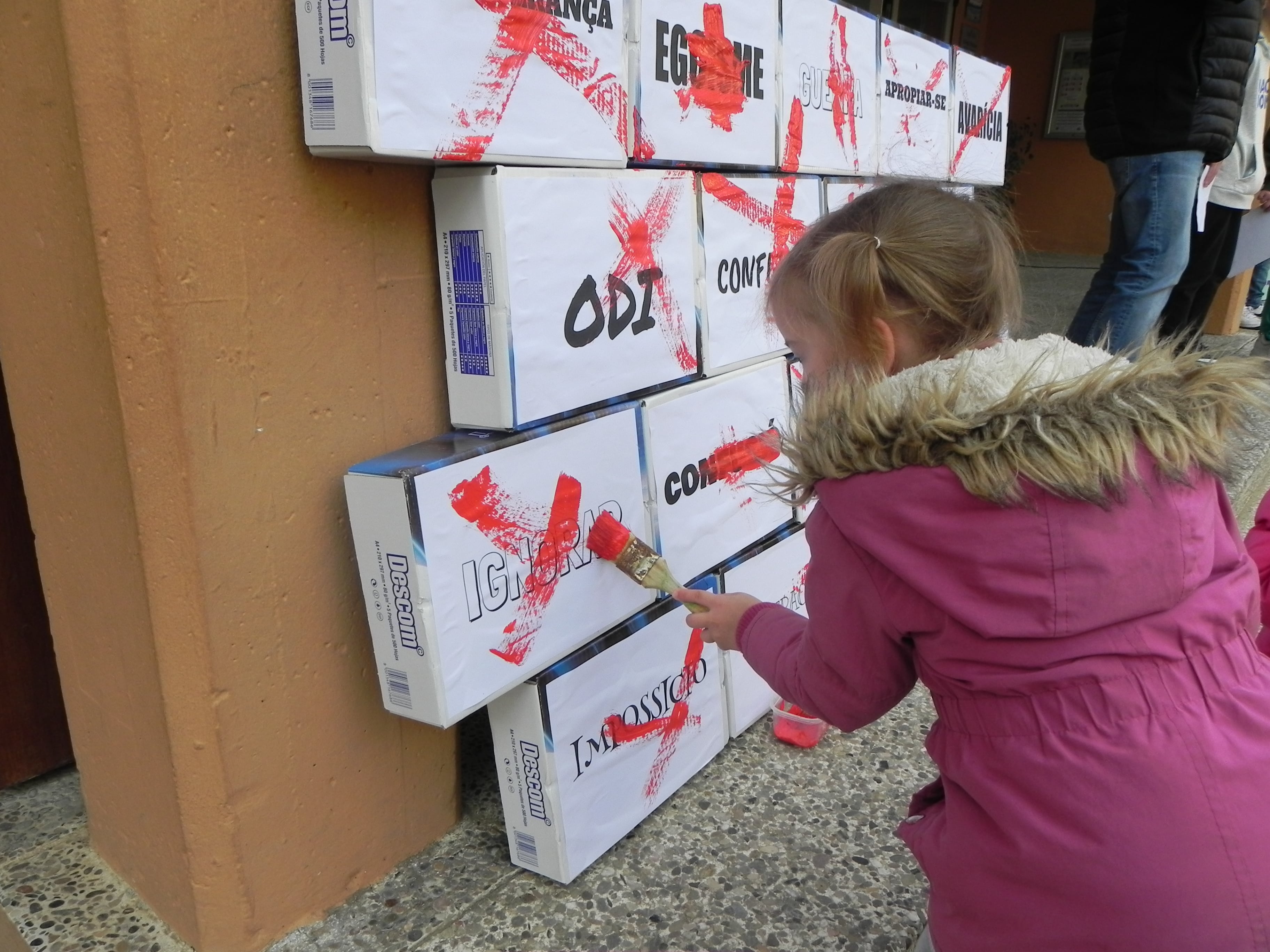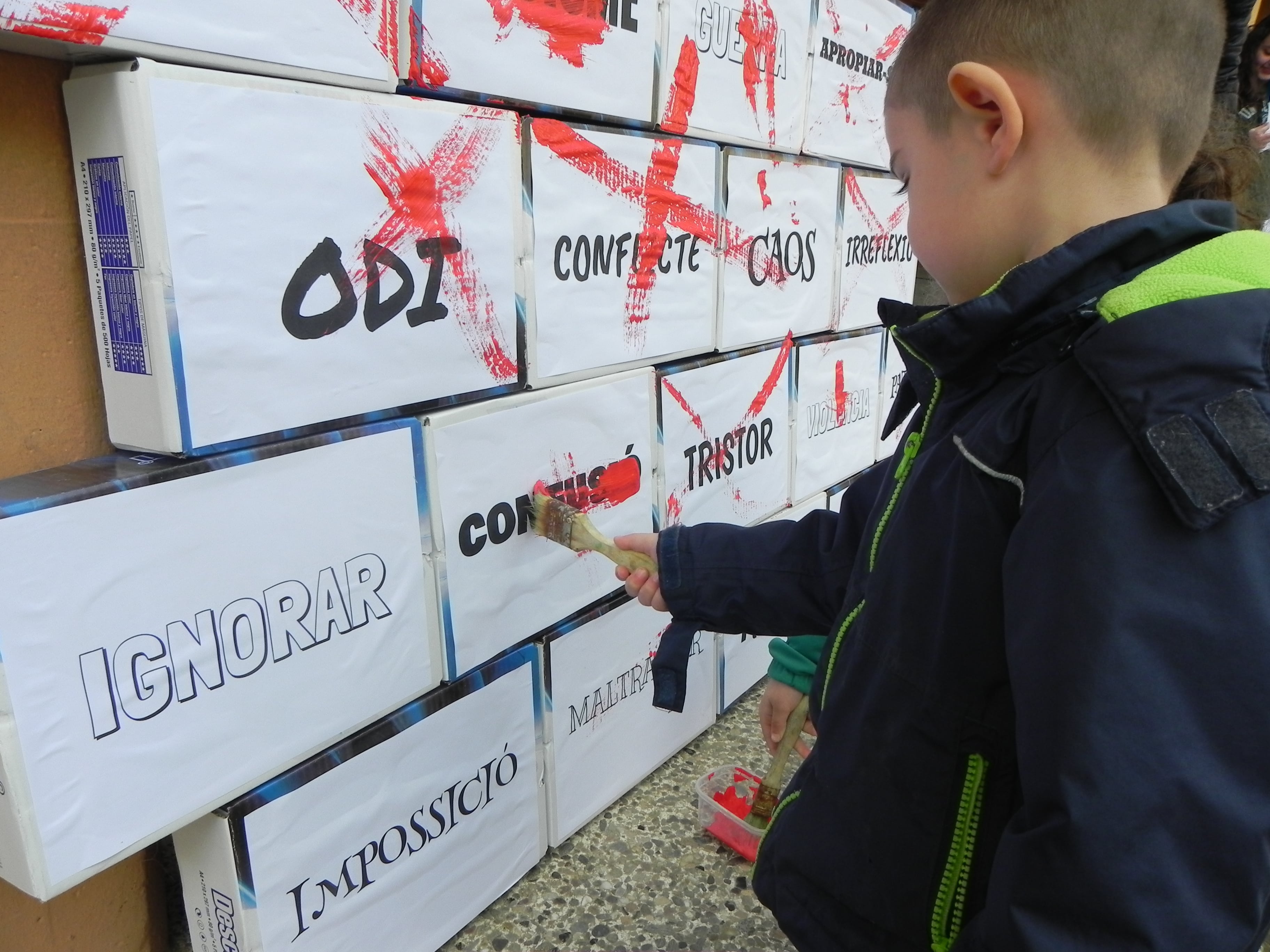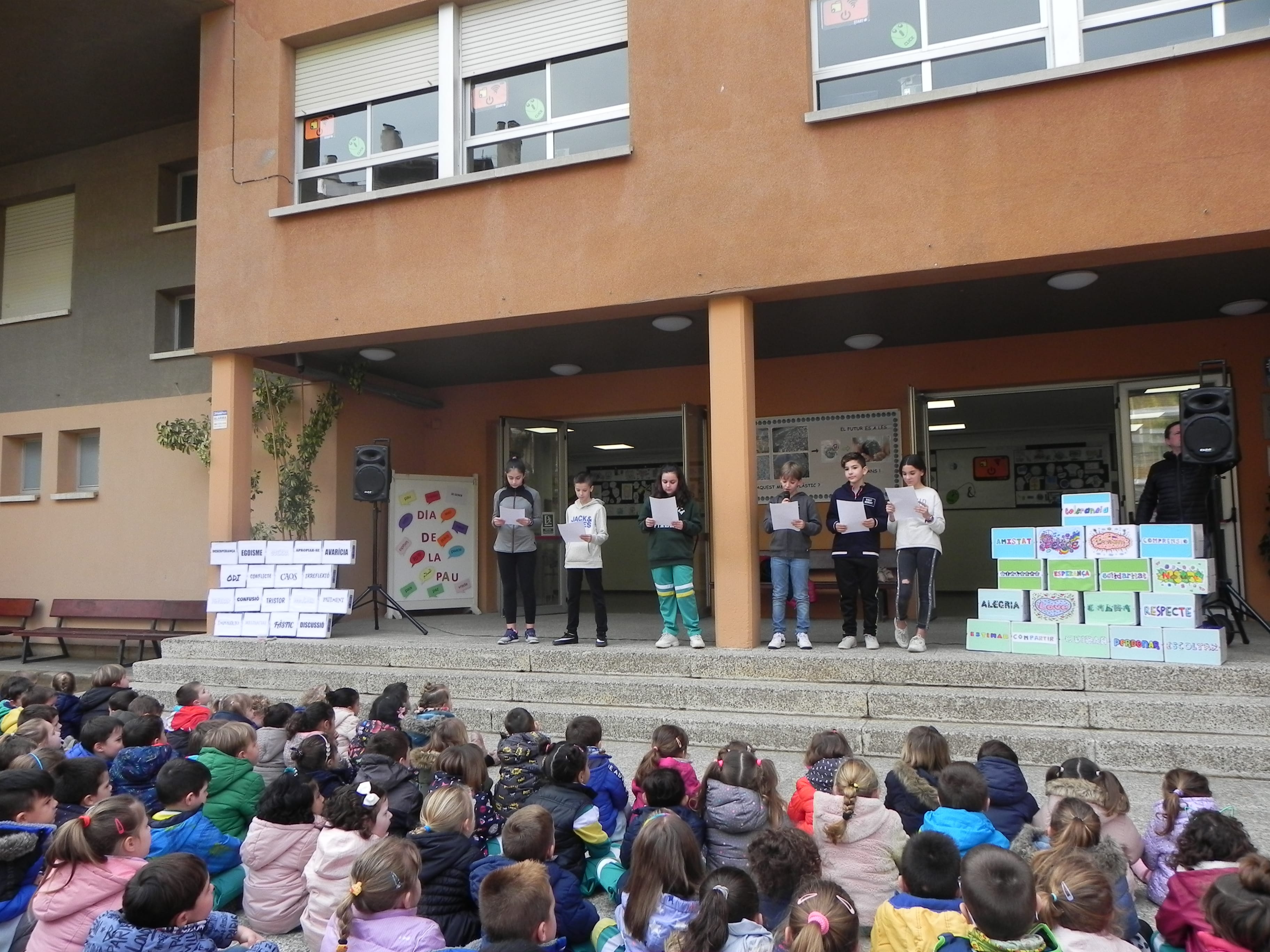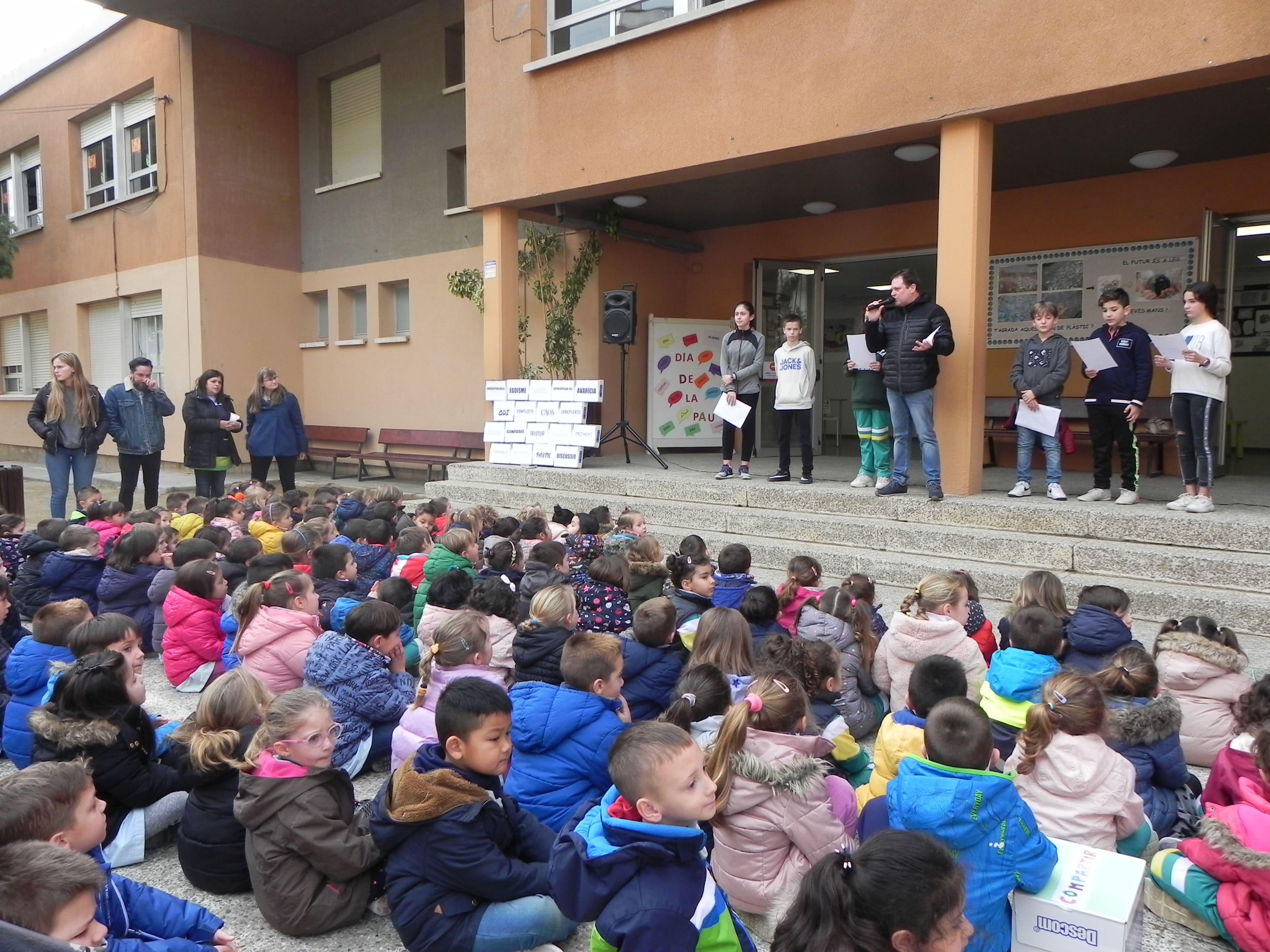 Aquest curs, dins del projecte d’escola verda, hem relacionat el tema de la Pau amb el canvi climàtic i sis alumnes de 6è ens han llegit un manifest, mentrestant es completava un mur de paraules “boniques” i ratllàvem un mur de paraules “lletges”.