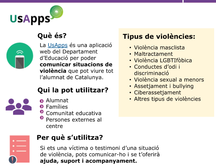 La ‘UsApps’ és l’eina que el Departament d’Educació posa a disposició de totes les persones de la comunitat educativa per comunicar les diferents situacions de violència que l’alumnat pot viure o ser-ne testimoni.