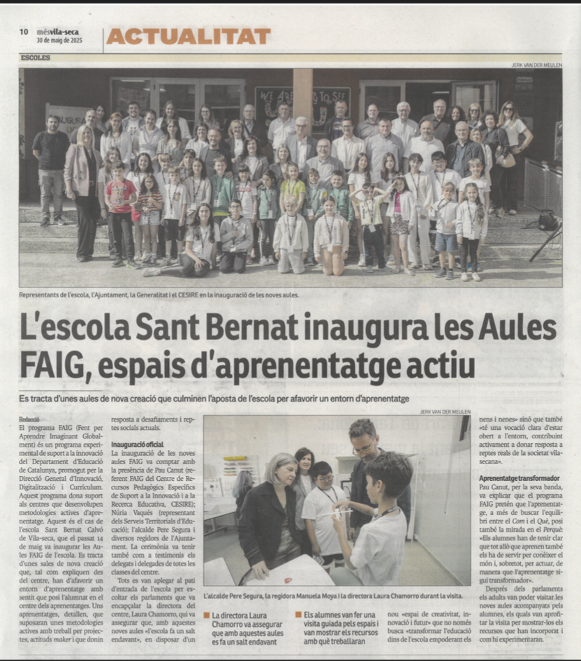 El passat dia 14 de maig vam fer la inauguració de Les Aules FAIG (Fent per Aprendre Imaginant Globalment) on vam comptar amb la presència de Pau Canut (referent FAIG del Centre de Recursos Pedagògics Específics de Suport a la Innovació i a la Recerca Educativa, CESIRE); Núria Vaqués (representant dels Serveis Territorials d’Educació); l’alcalde Pere Segura i diversos regidors de l’Ajuntament.