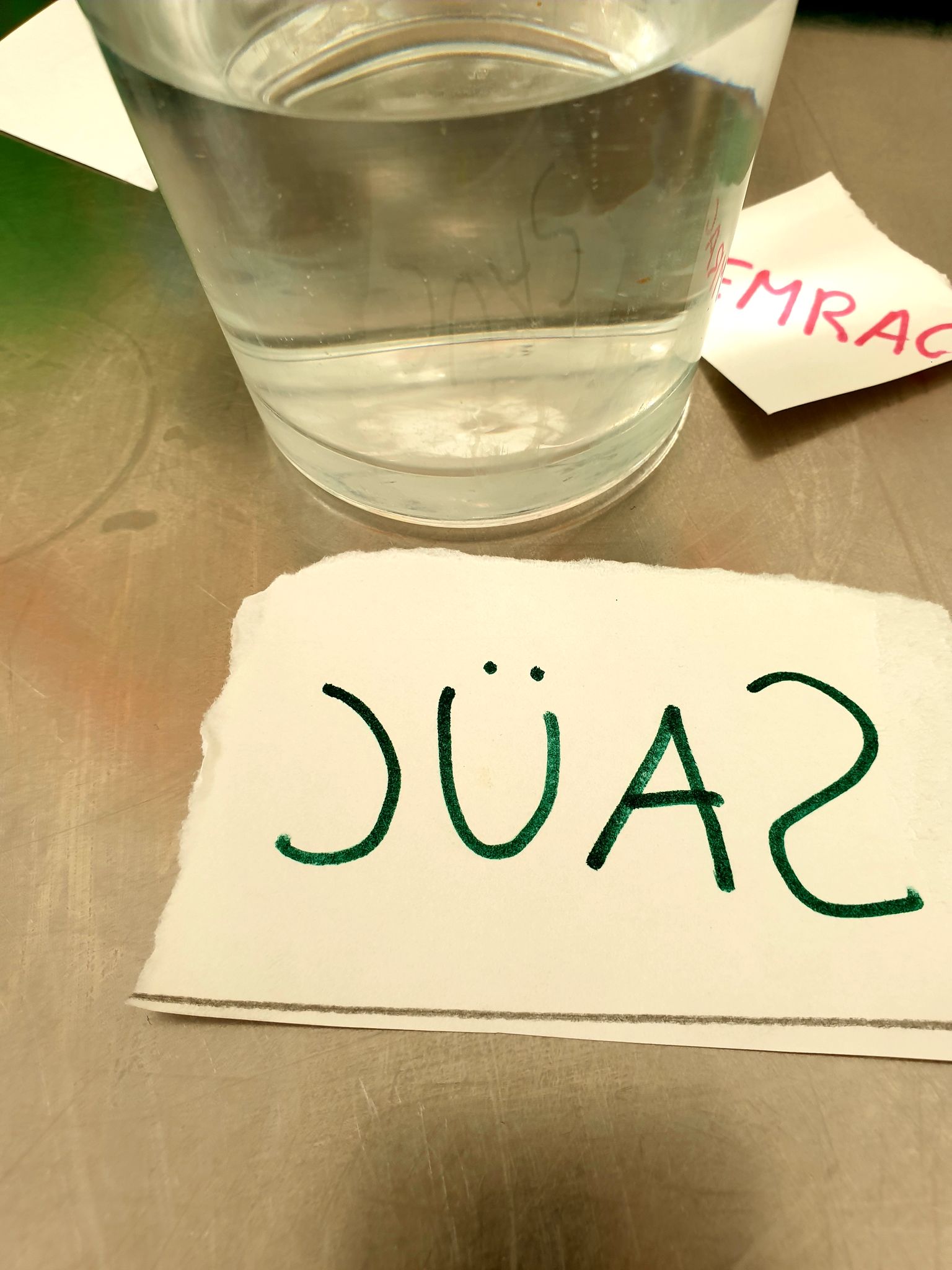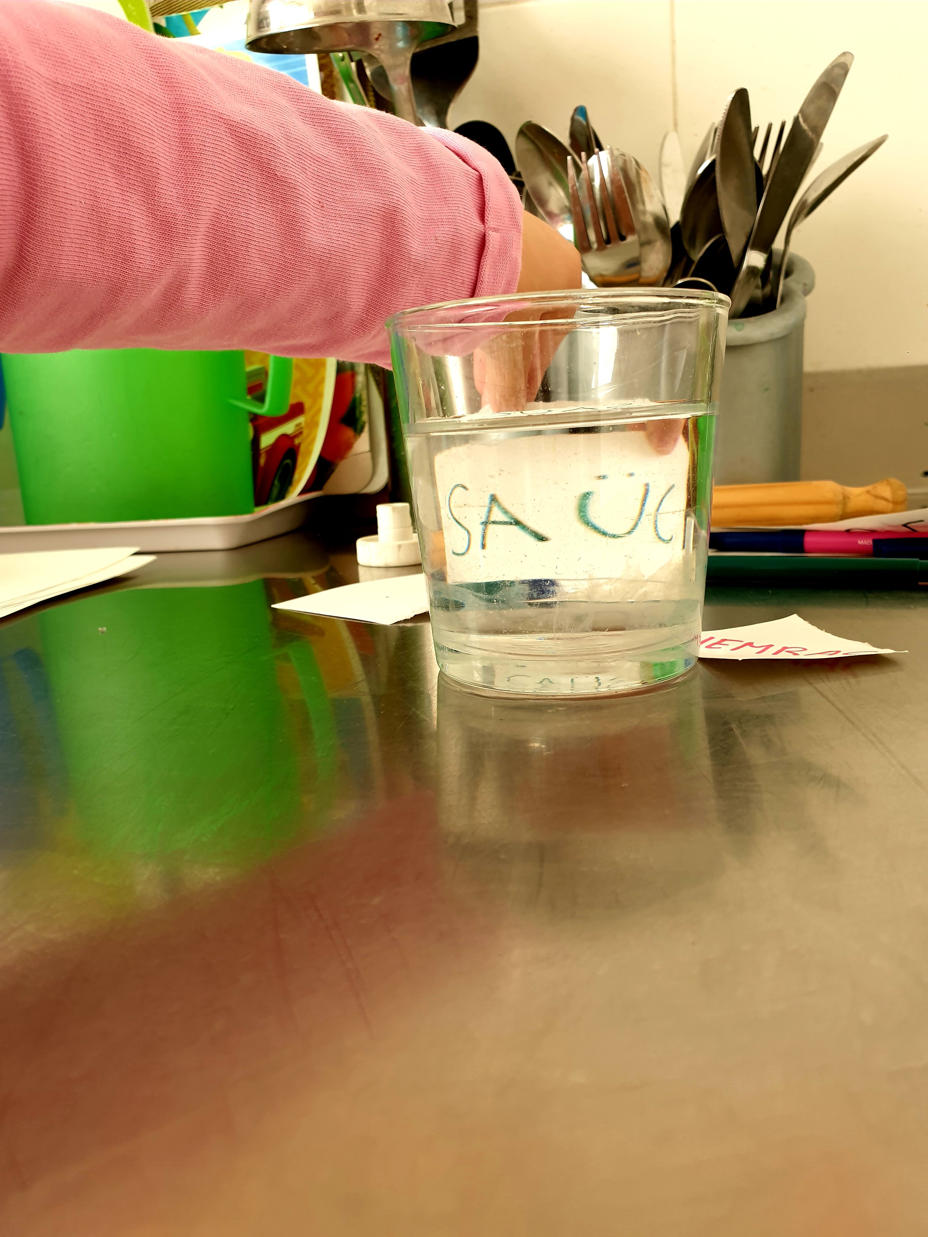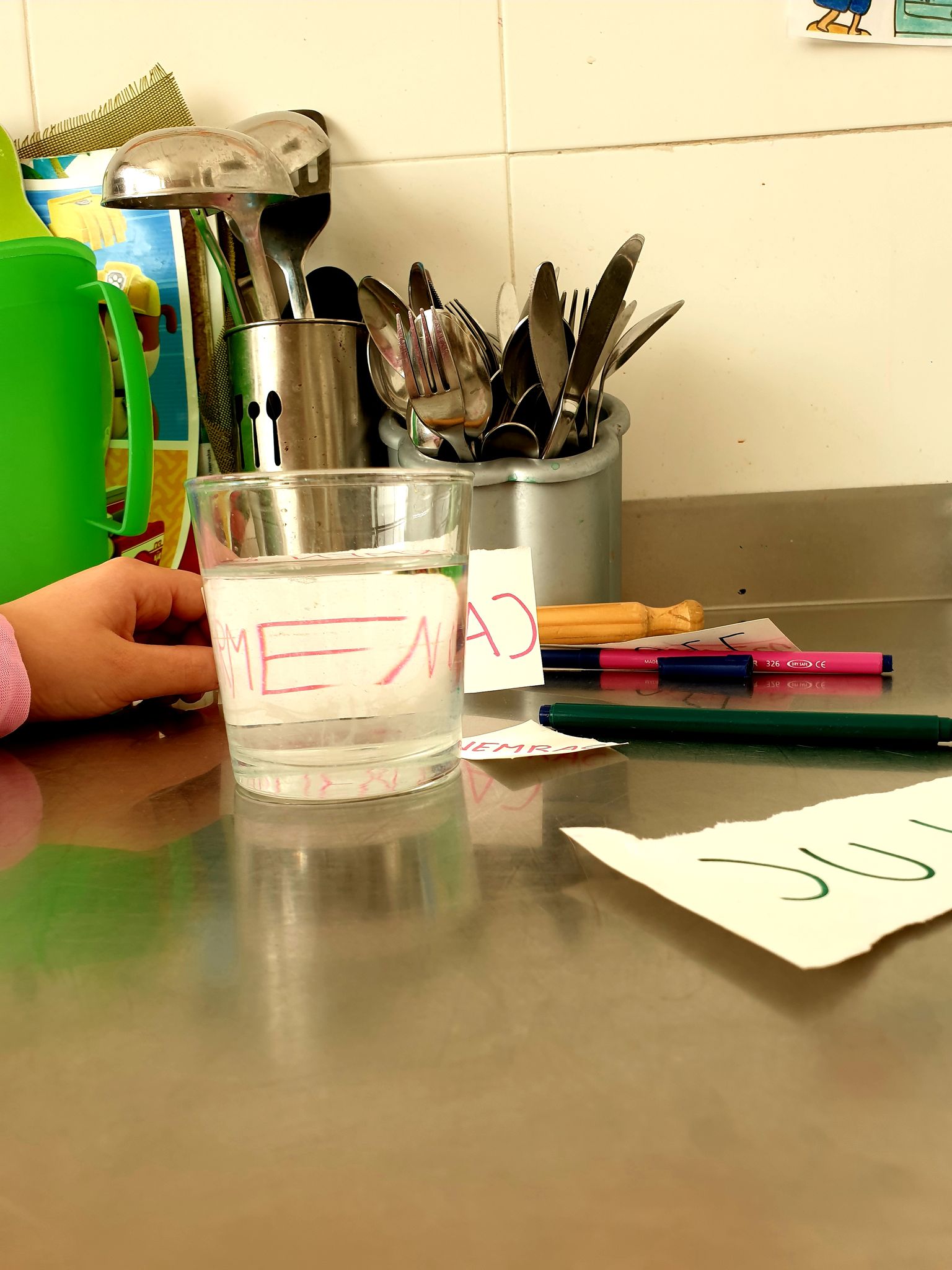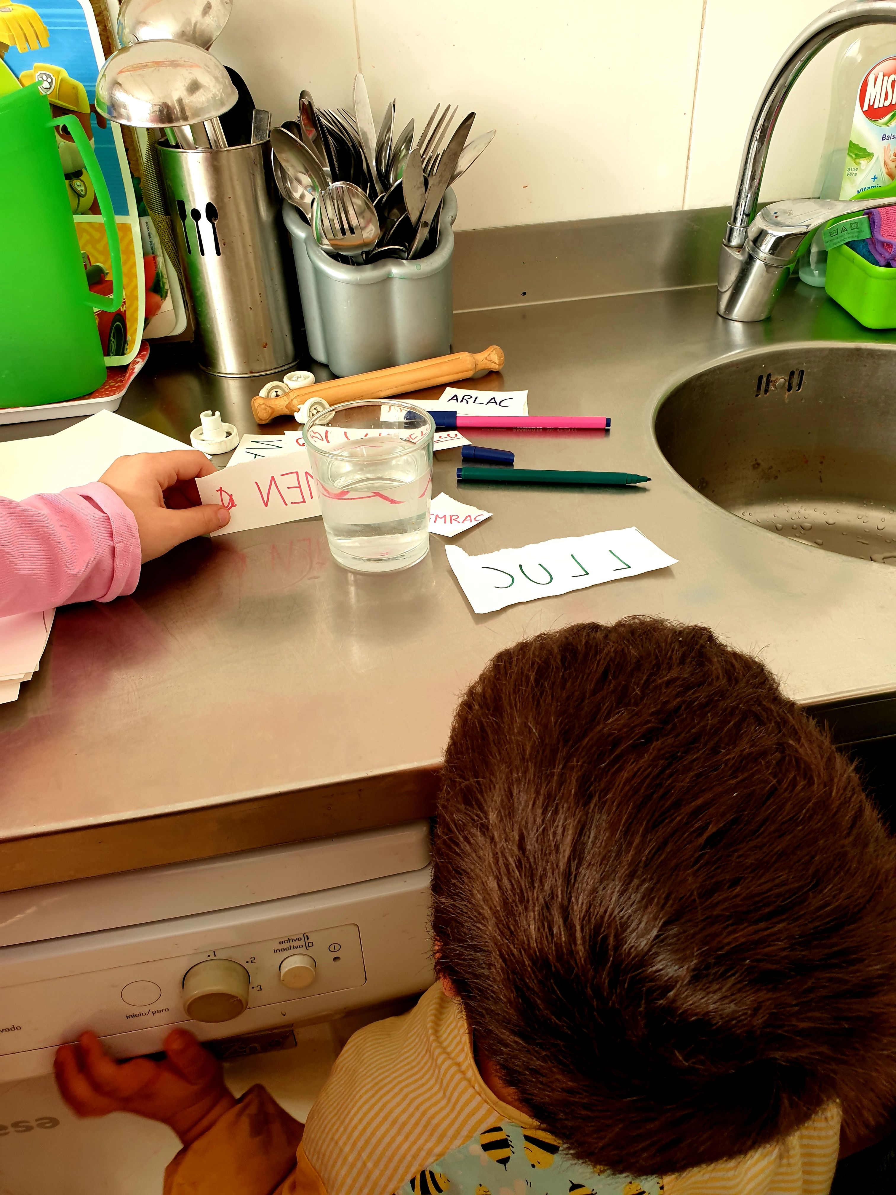 EXPERIMENT 1 : Vam escriure el nostre nom al revés i al posar-lo darrere d’un got amb aigua… tatxan! El nom es podia llegir del dret. Quan els grans facin la fitxa de l’experiment, aprendran que això passa a causa de que l’aigua forma una lent convexa que provoca que les imatges es vegin invertides.