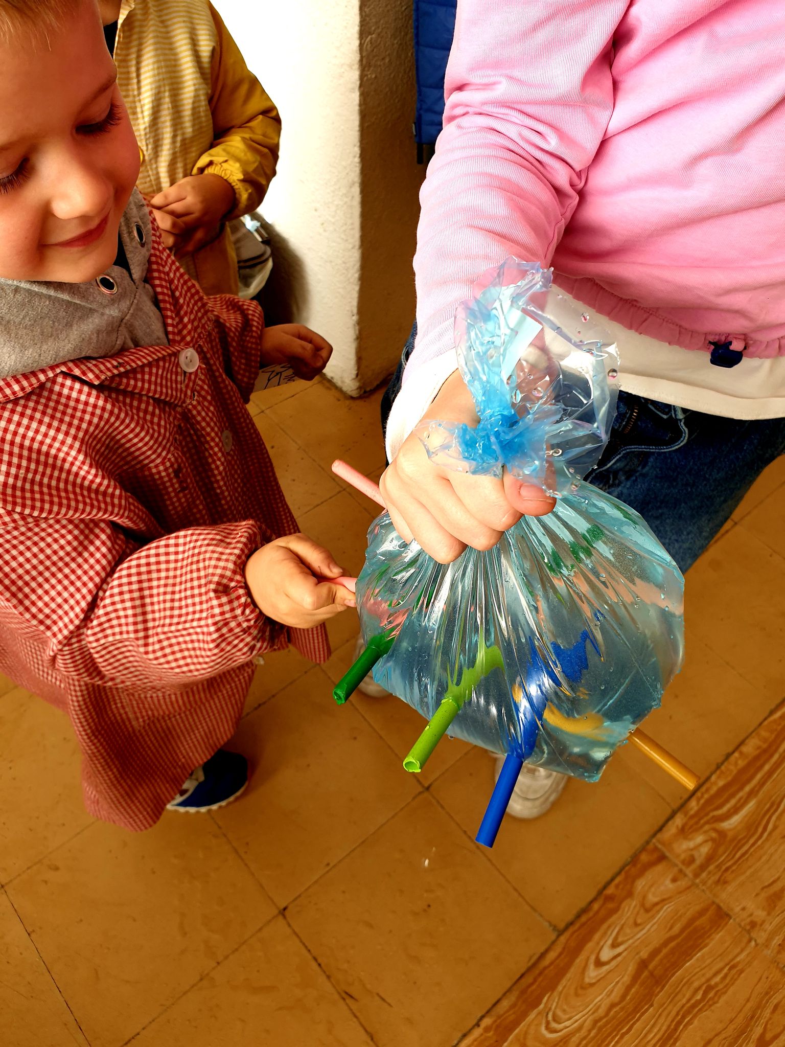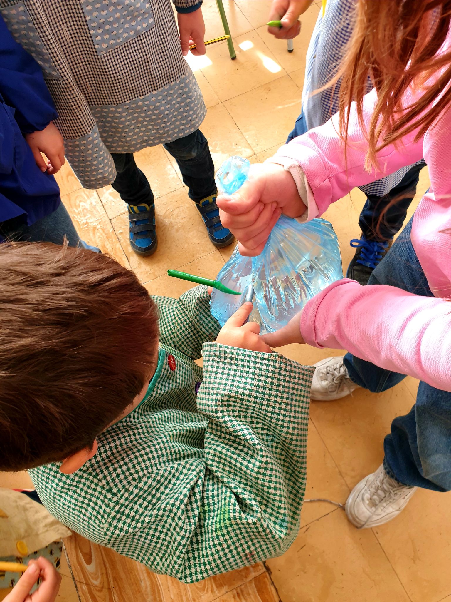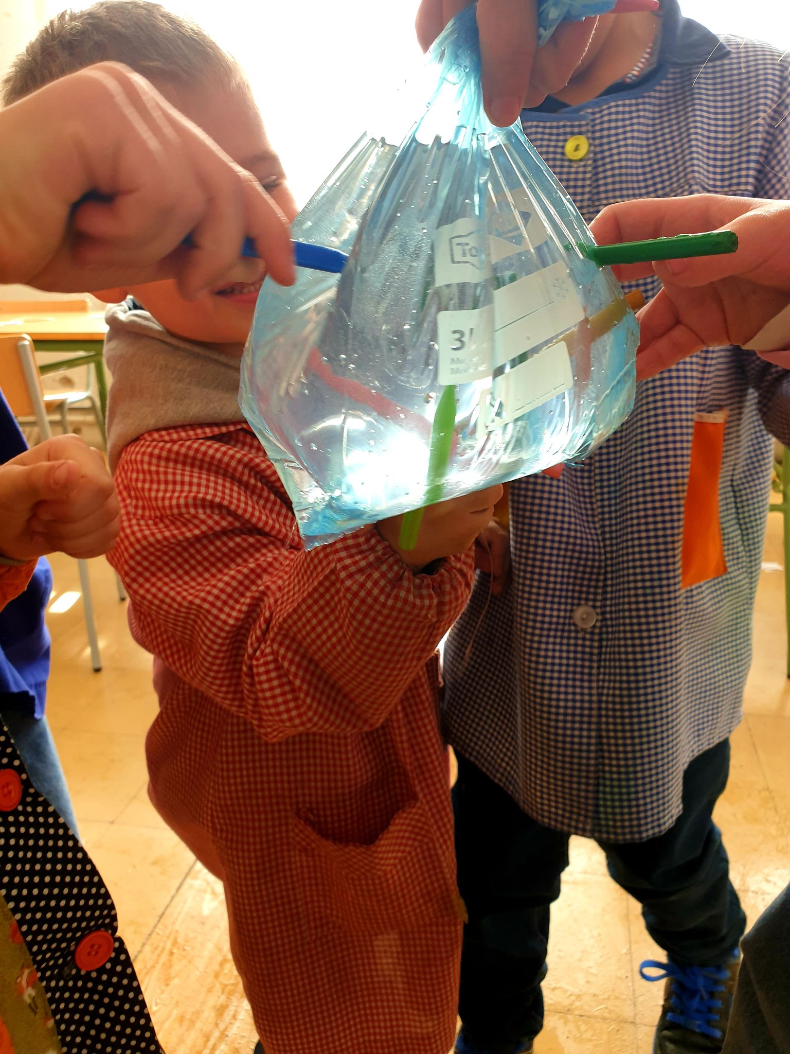 EXPERIMENT 2: Vam omplir una bossa de plàstic amb aigua i vam clavar un munt de colors a la bossa. La sorpresa va ser al veure que encara que foradéssim la bossa amb els colors no sortia ni una gota d’aigua! (excepte per un petit accident que vam tenir, amb el que vam aprendre que si traiem el color un cop clavat, sí que surt aigua). Quan els grans analitzin l’experiment aprendran que aquest fenomen succeeix degut a que els plàstics de la bossa són molt flexibles i creen un segell que envolta els colors.