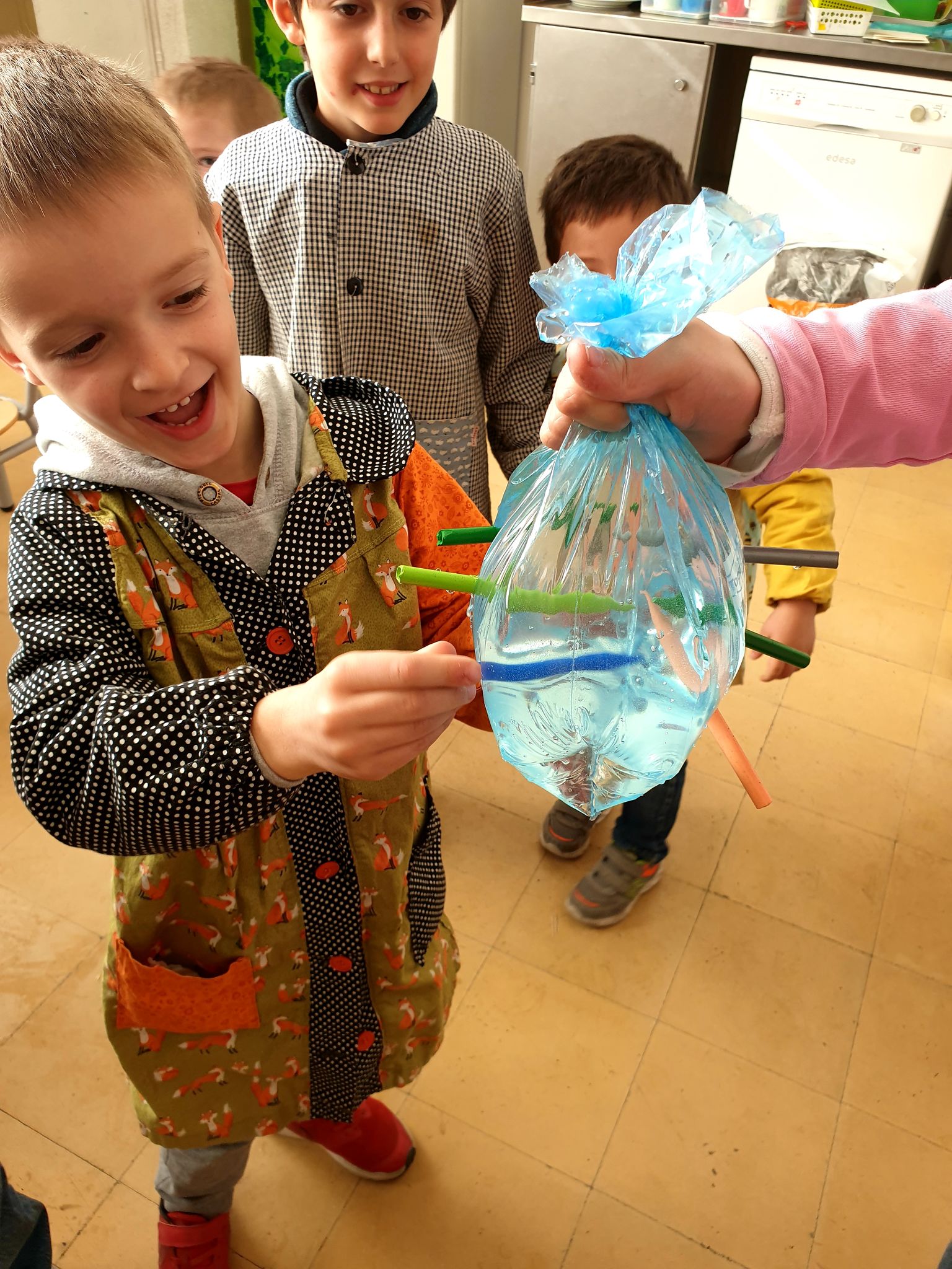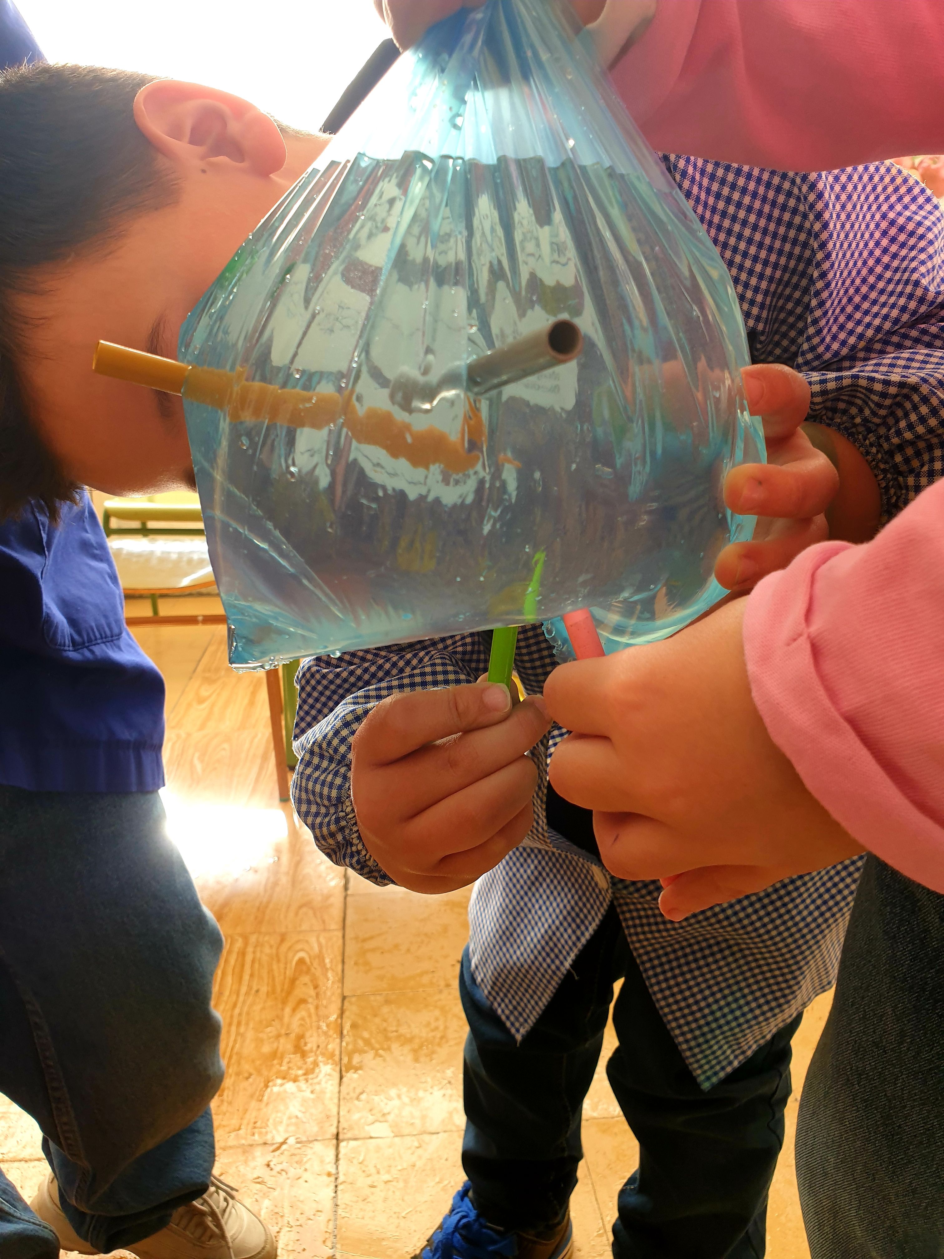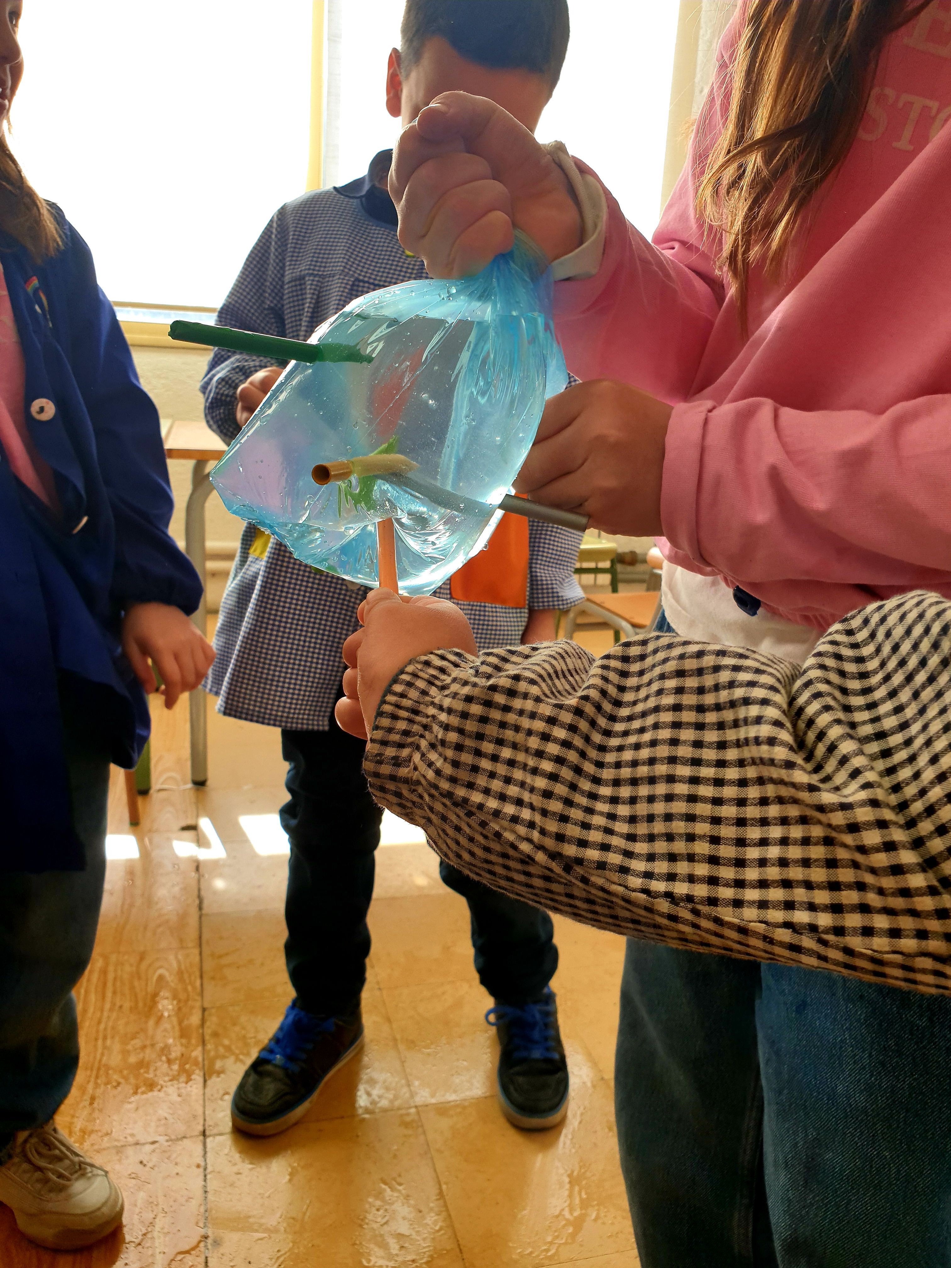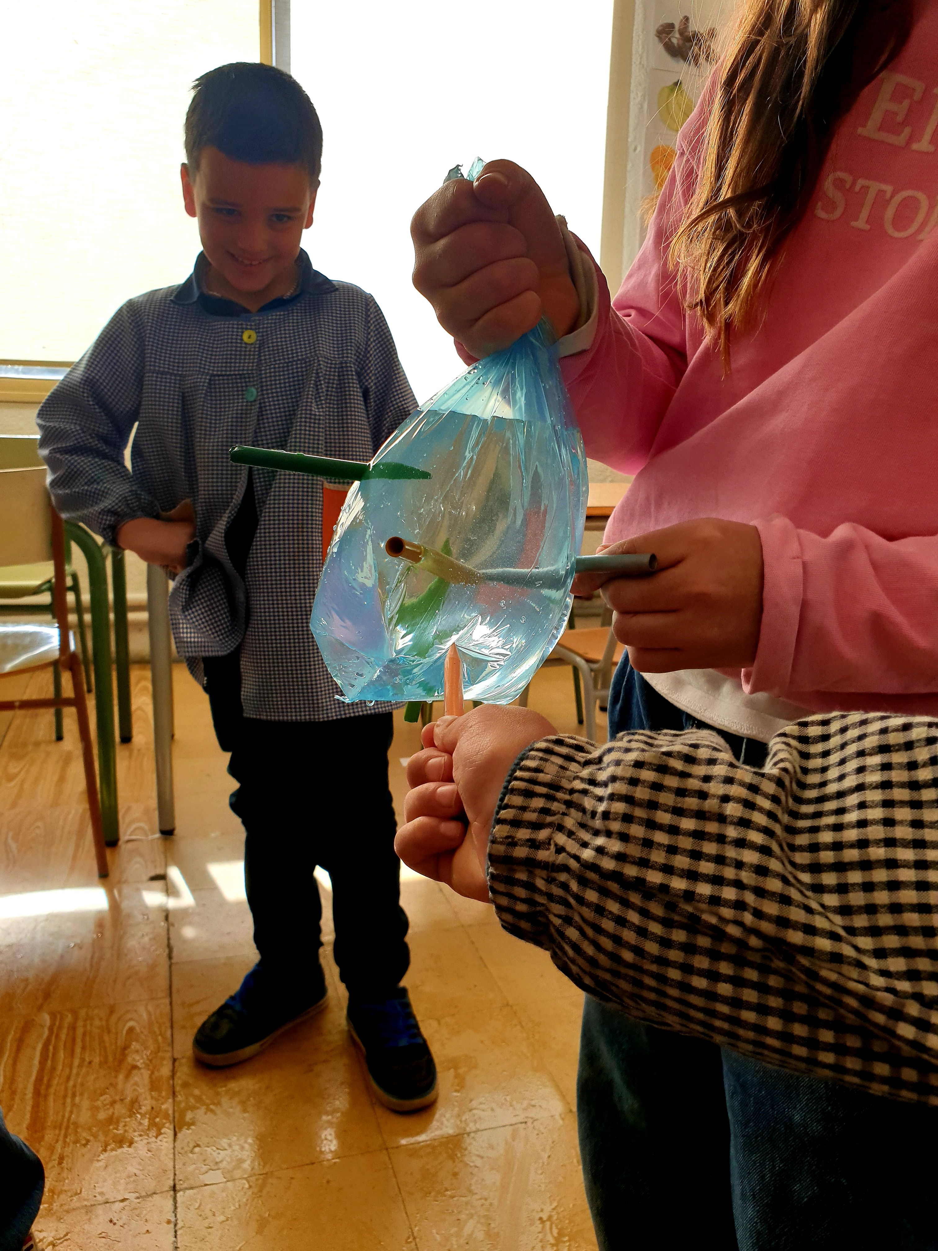 EXPERIMENT 2: Vam omplir una bossa de plàstic amb aigua i vam clavar un munt de colors a la bossa. La sorpresa va ser al veure que encara que foradéssim la bossa amb els colors no sortia ni una gota d’aigua! (excepte per un petit accident que vam tenir, amb el que vam aprendre que si traiem el color un cop clavat, sí que surt aigua). Quan els grans analitzin l’experiment aprendran que aquest fenomen succeeix degut a que els plàstics de la bossa són molt flexibles i creen un segell que envolta els colors.