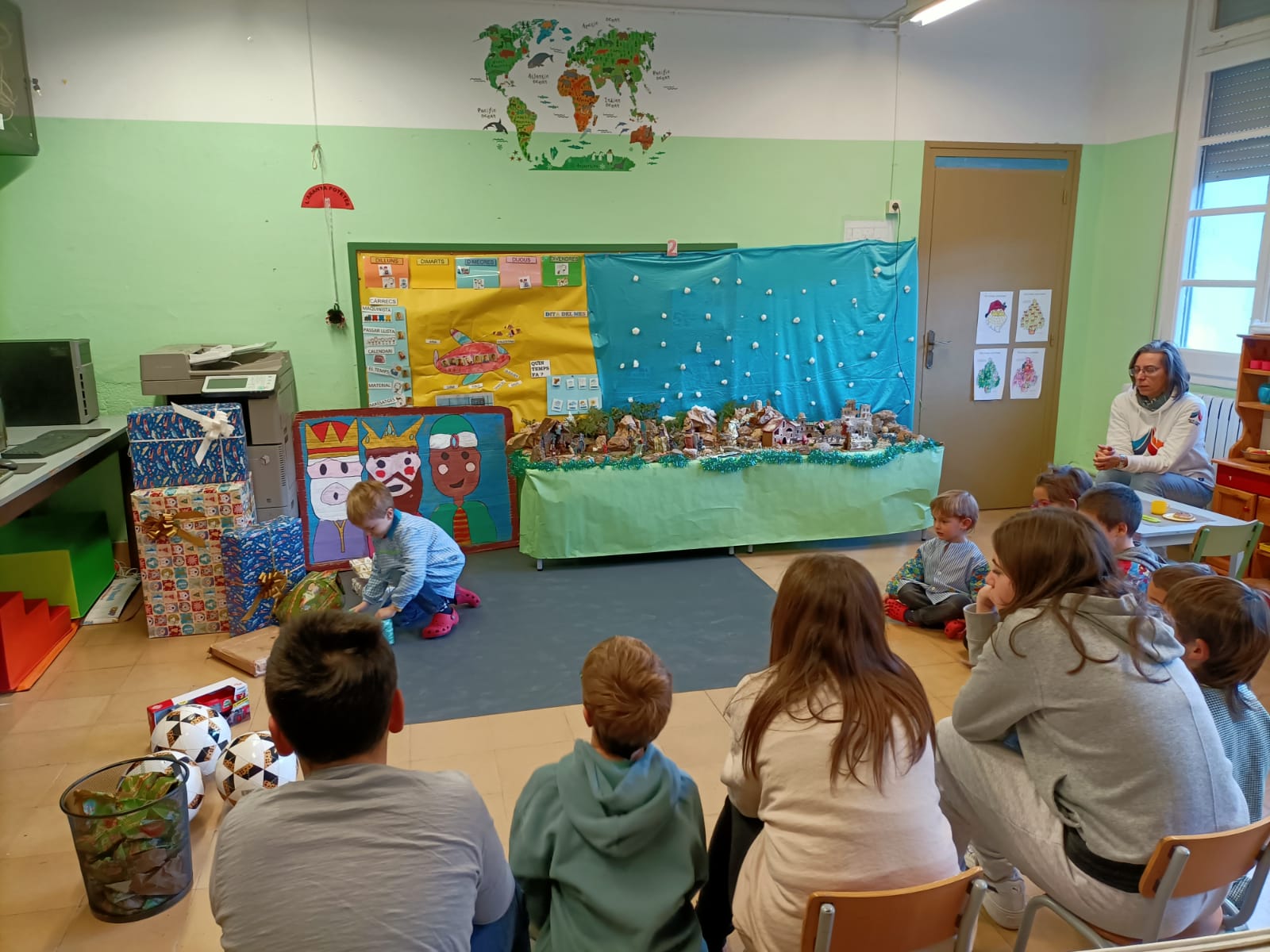 Els reis mags van dur pilotes, una tablet, tractors de joguina, llibres de text per totes les edats, jocs que havien demanat els alumnes a la carta, com el jenga, l’uno, altres com 10 cerditos de matemàtiques, Daus per crear històries a llengua, ritmo i bola…