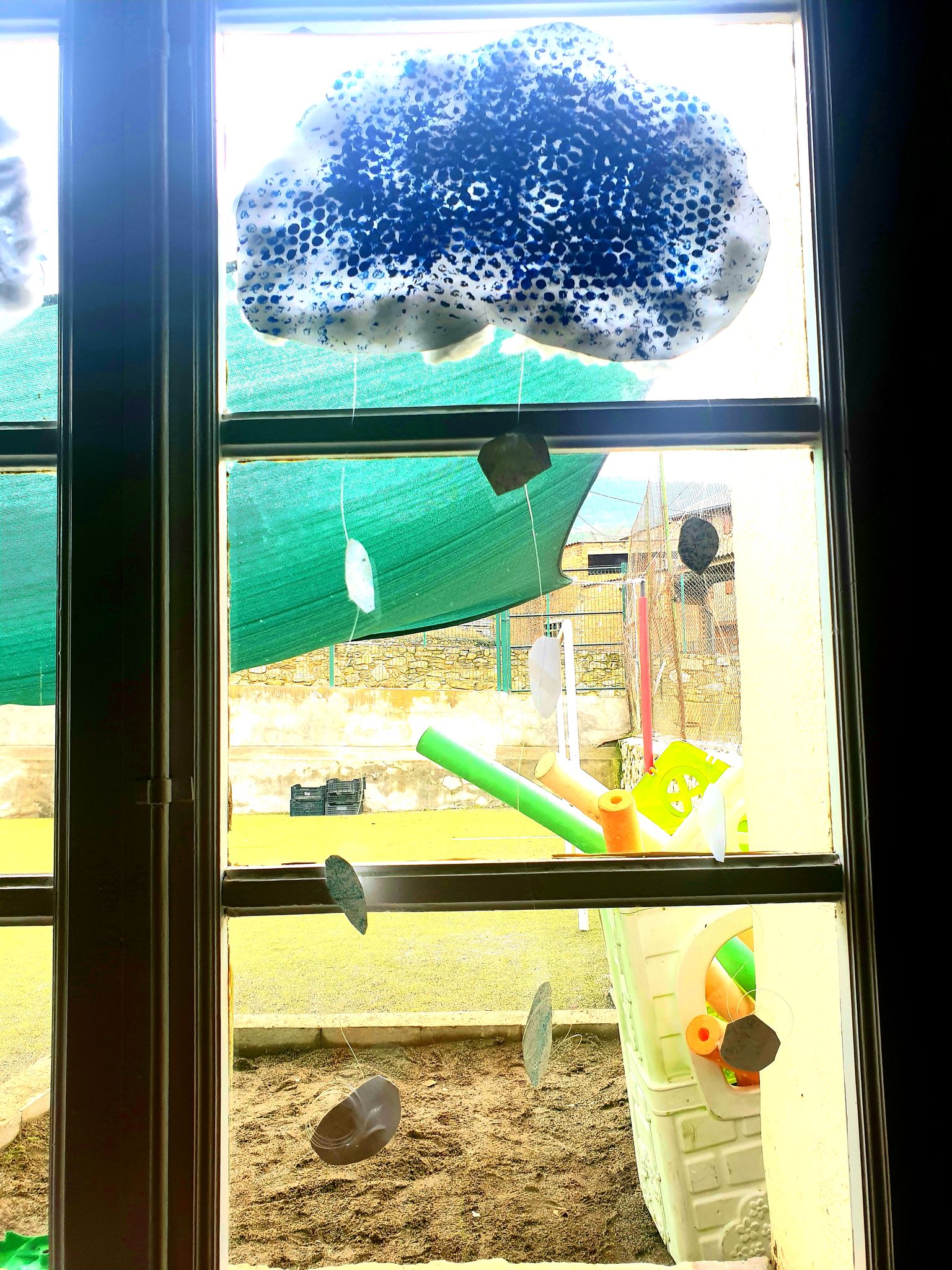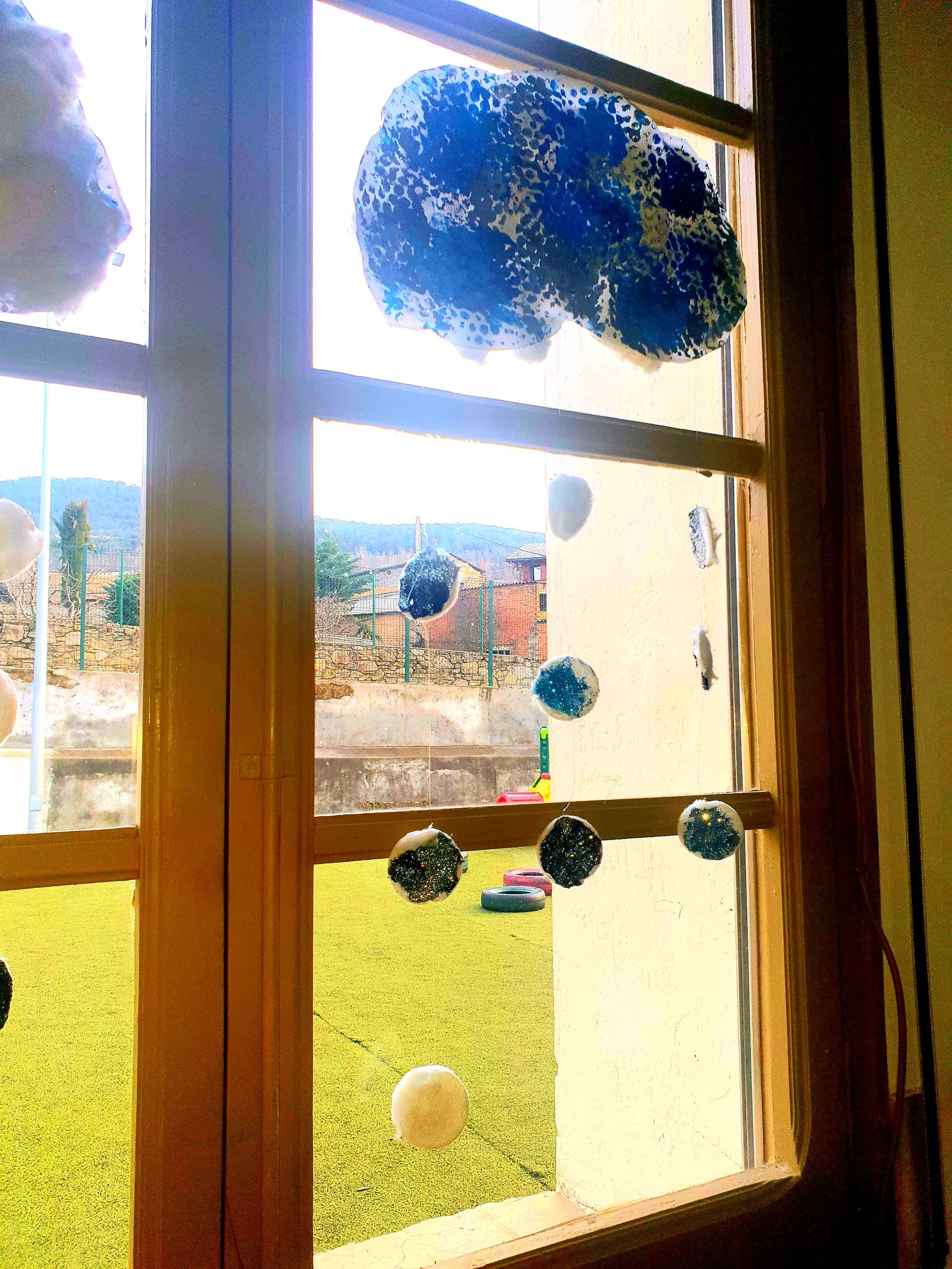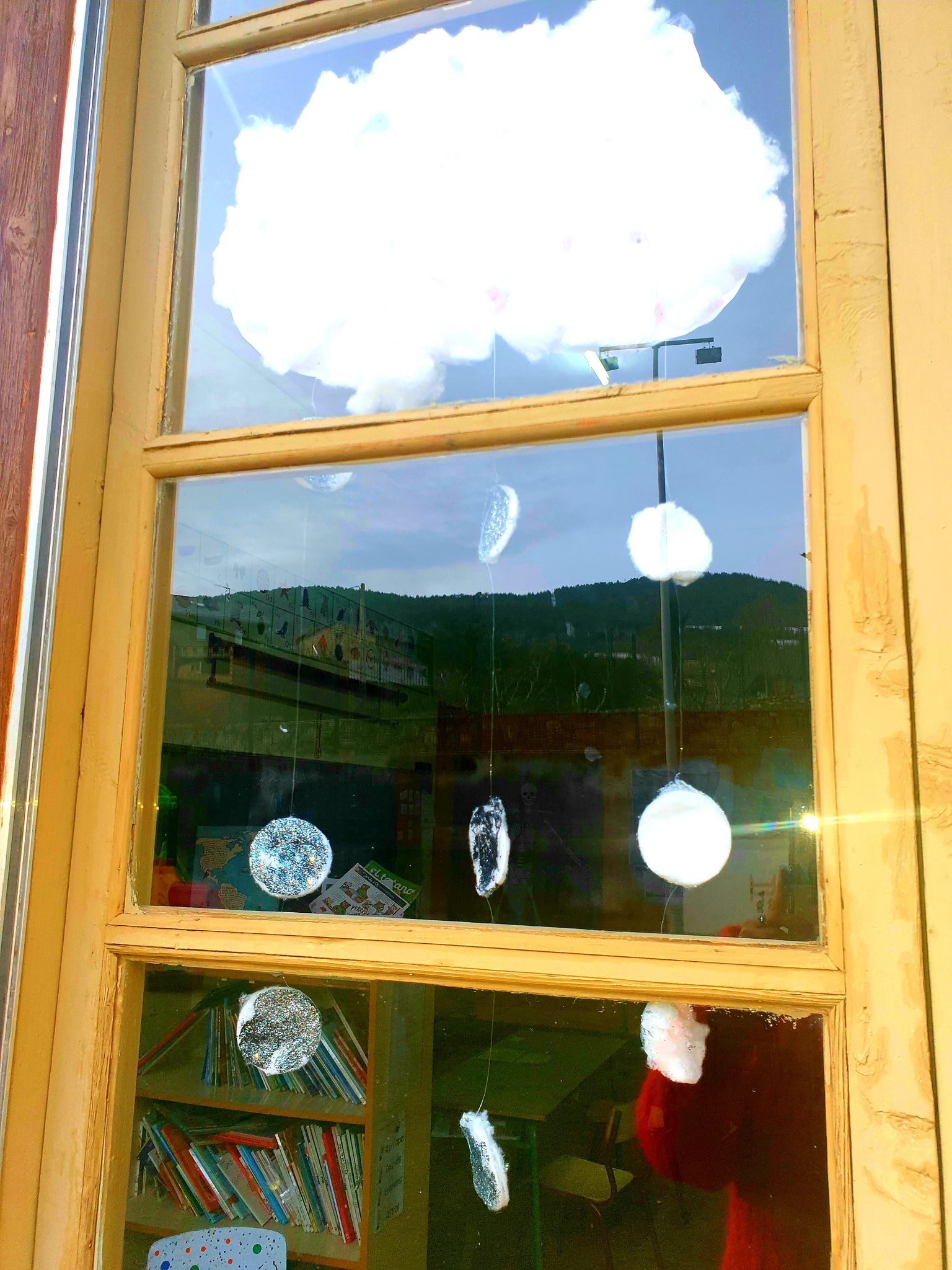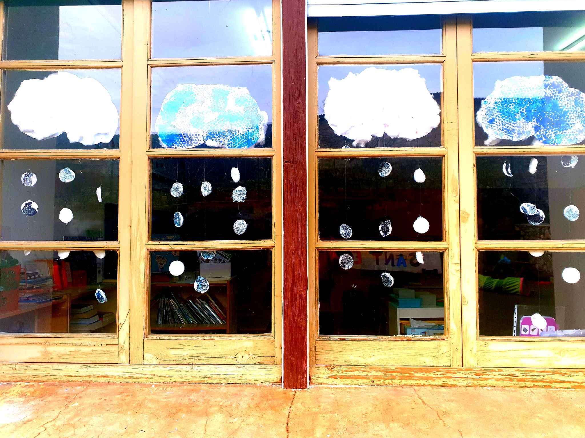 Decorem les finestres de la classe amb uns núvols d’hivern.