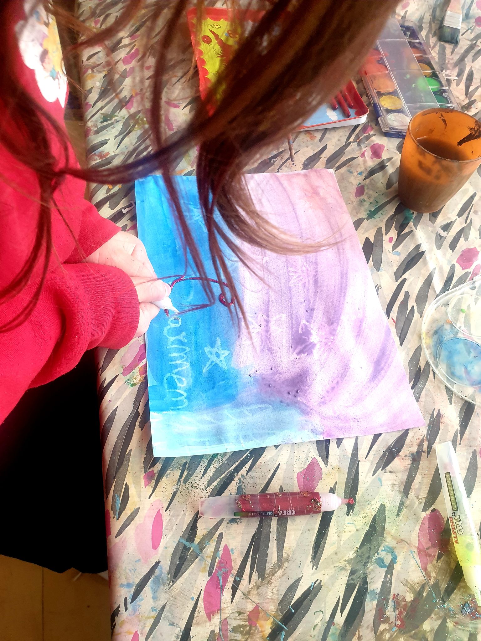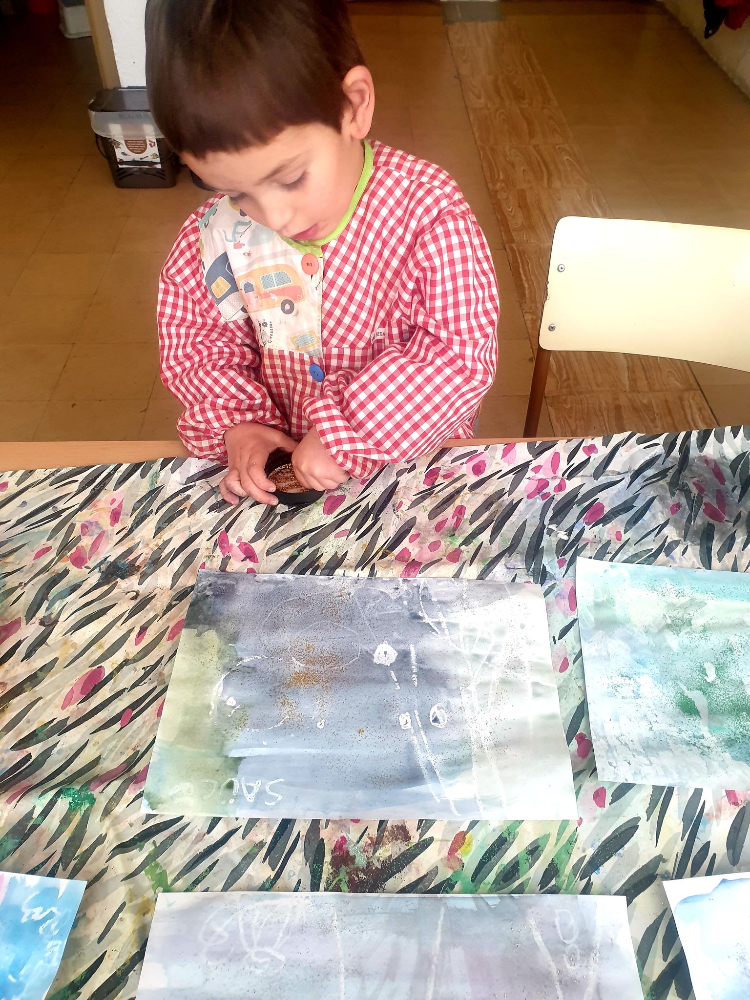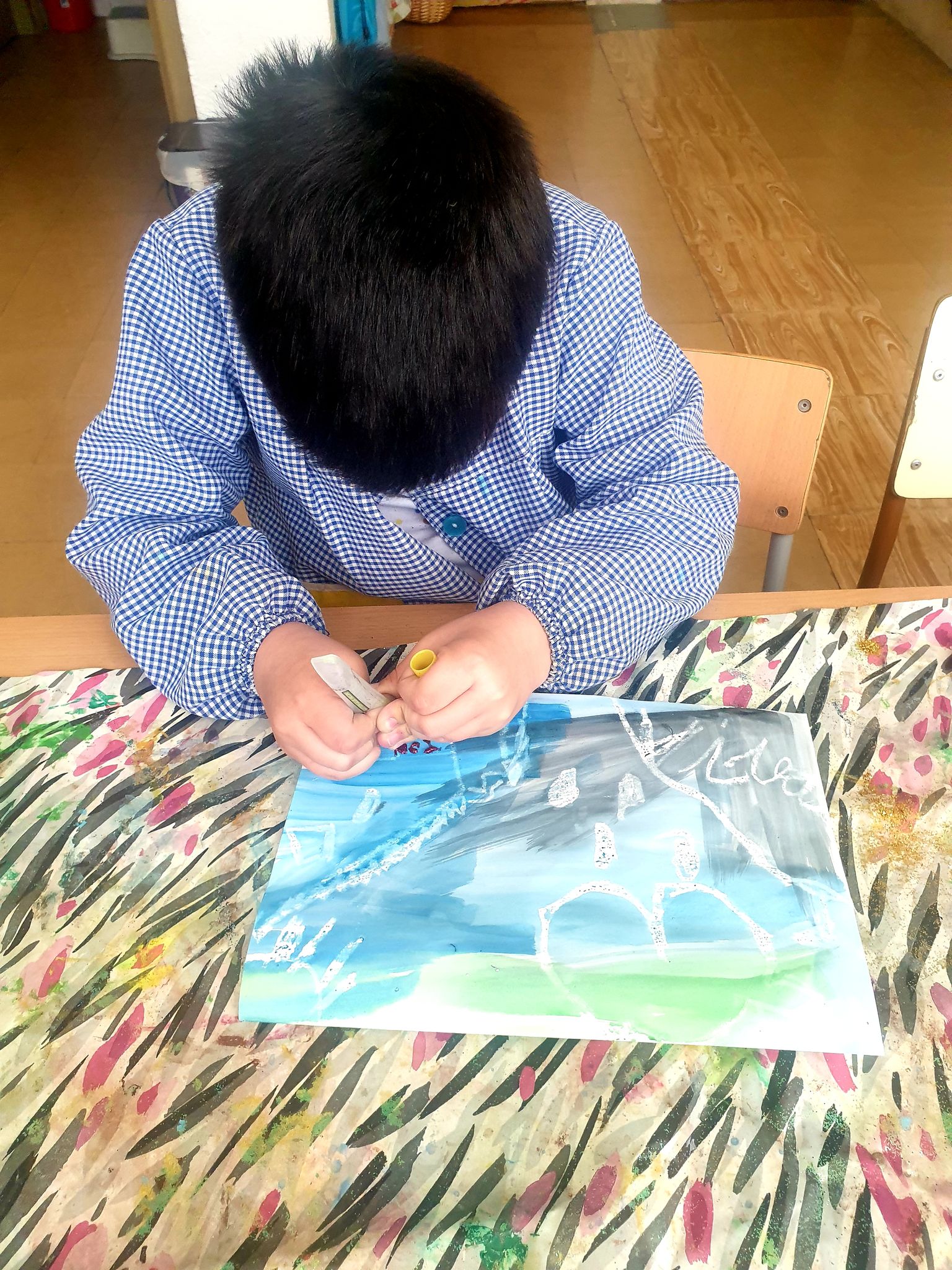 Dibuixem un paisatge d’hivern amb la tècnica de la cera i l’aquarel·la. El dibuix és màgic, ja que quan el pintem amb la cera blanca no el veiem i quan hi afegim l’aquarel·la apareix com per art de màgia. A més utilitzem els colors freds de l’hivern.