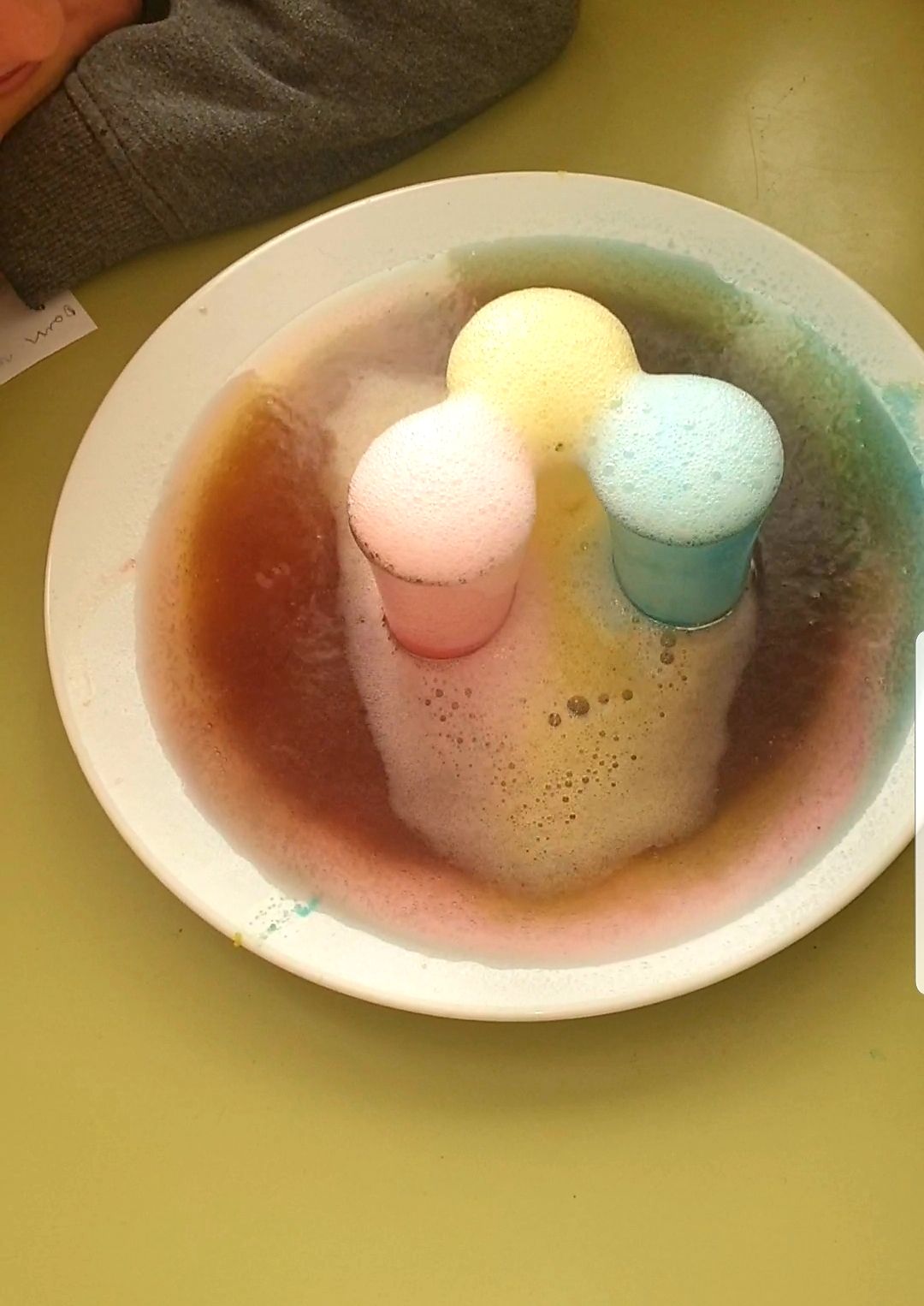 Vam treballar la ciència fent l’experiment de l’slime amb diferents substàncies i després vam treballar l’art a l’hora de decorar el recipient.