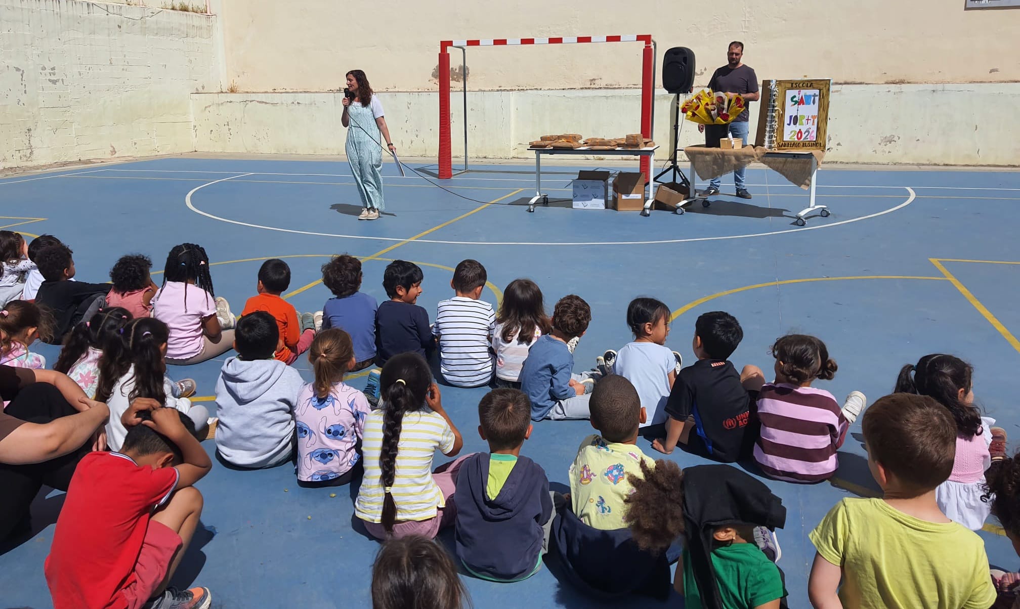 Després, ens vam reunir tota l’escola al pati dels grans per compartir un moment molt bonic: l’entrega de llibres i una rosa per a cada classe. Quina il·lusió!
